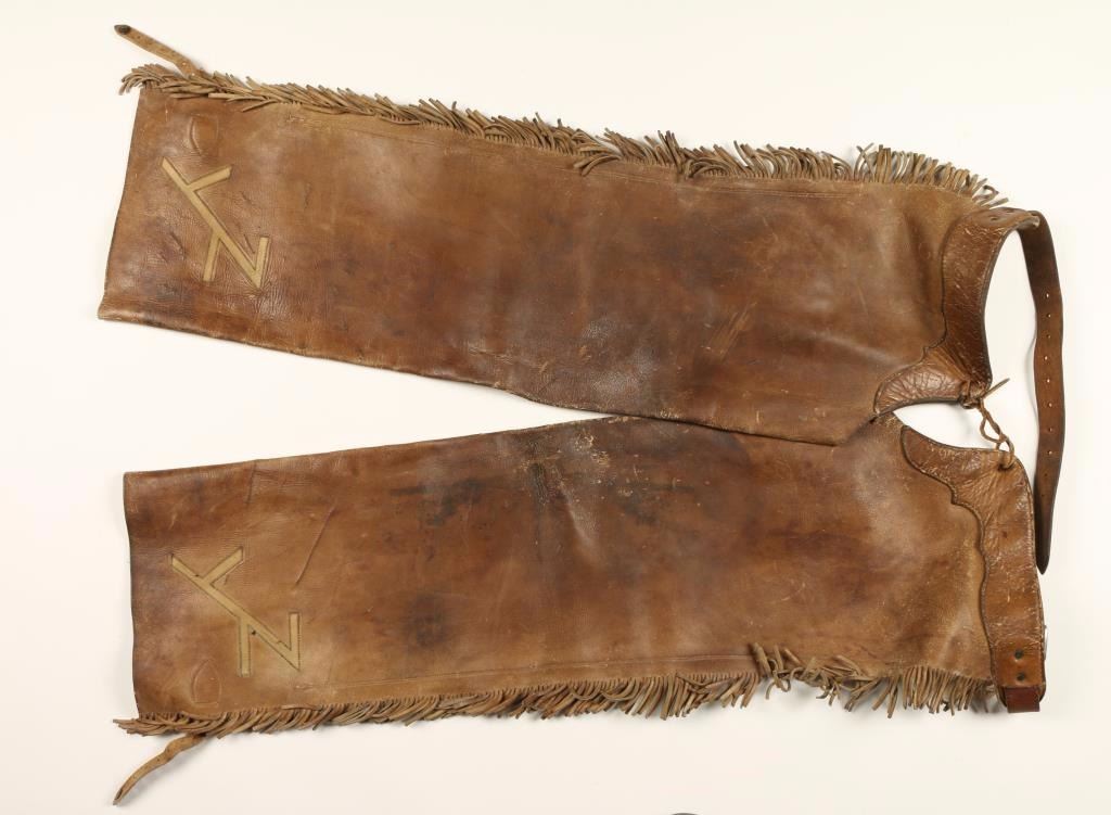 Smooth brown leather with fringe, has a 'YZ Ranch Brand' on sides. Show age and use.