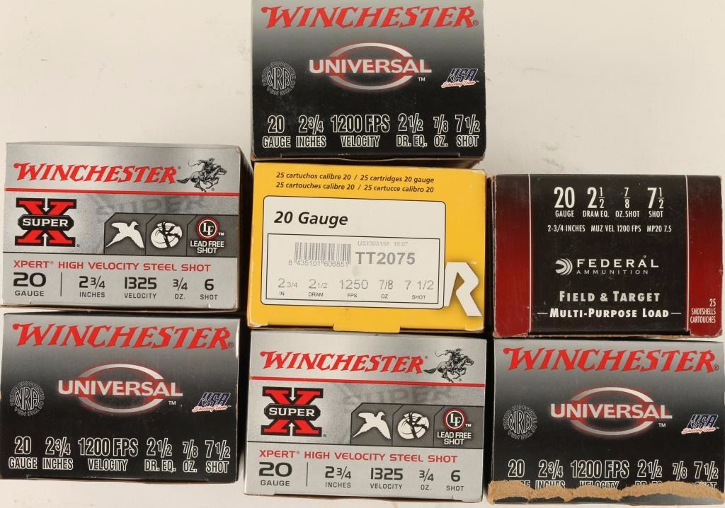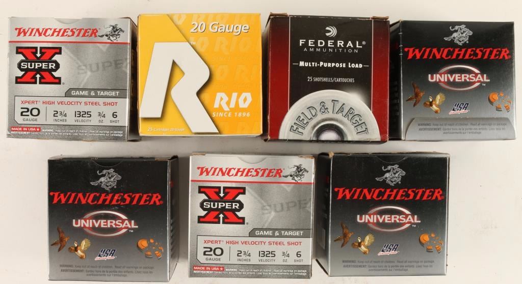 Consisting of seven twenty-five round boxes of mostly 7 1/2 shot from makers; Winchester, Federal and Rio.