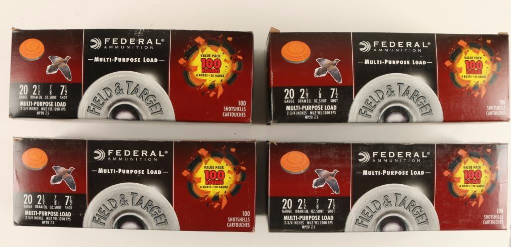 Consisting of four 100 round boxes of Federal Field & Target 2 3/4" 7/8 ounce 7 1/2 shot, shells.