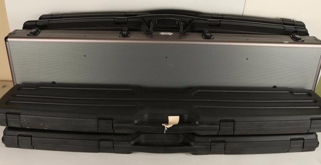 2 Plano double rifle cases, 2 Dosko Sport single rifle cases and 1 ABG Sport aluminum double rifle case. Excellent condition.