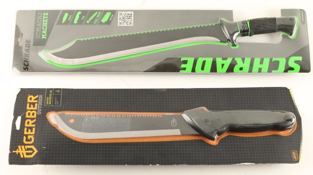 1 Schrade Scmach2 with 14.5" stainless steel blade and nylon sheath. 1 Gerber Outdoor Gator Machete Jr. with 11.25" carbon steel blade and ballistic nylon sheath. Both in original packaging.