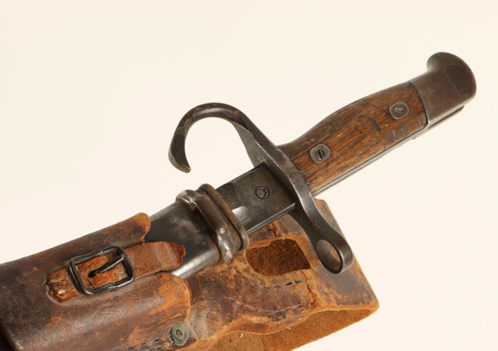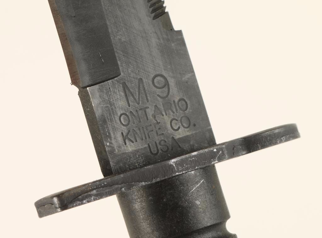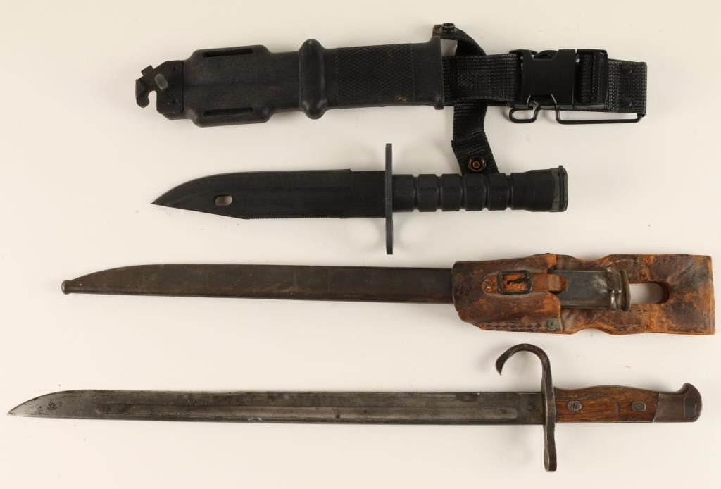 Arisaka bayonet with scabbard and leather hanger and an M9 Ontario Knife Company, bayonet and scabbard fits AR-15.