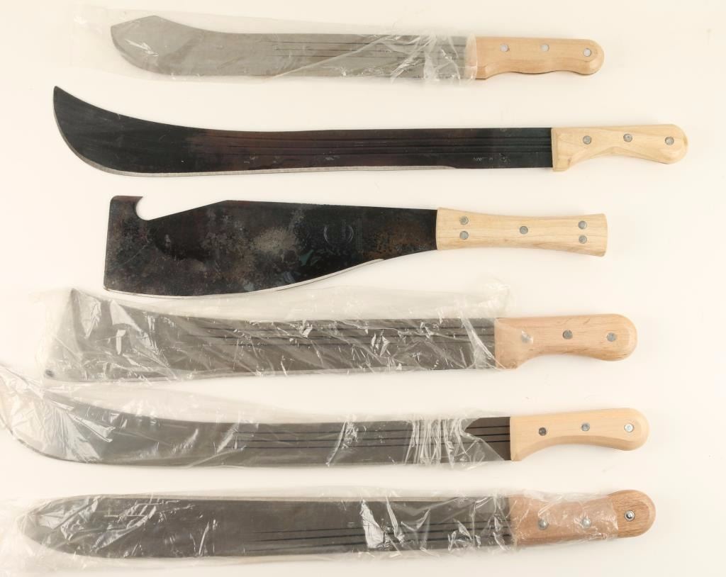 2 unmarked, 1 JMK, 2 Gavilans, and 1 other all with wood handles and various blades measuring 14-22". 2 show use and wear, otherwise good condition.