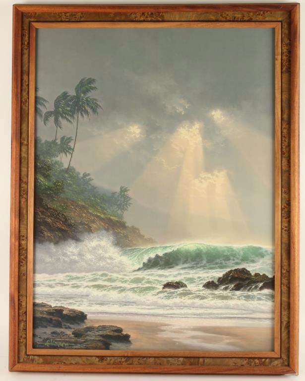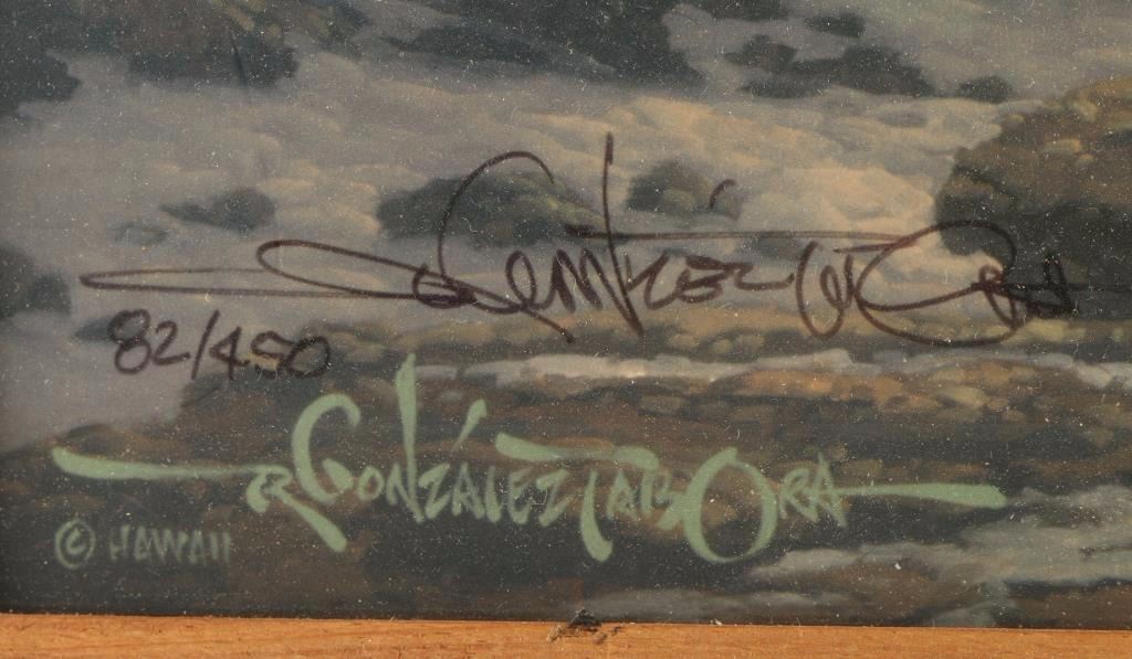 "Through Days of Grey" limited edition lithograph print 82/450 signed by the artist R. Gonzalez Tabora. Depicting sun coming through the clouds onto a tropical island and waves. Comes with certificate of authenticity. In wooden frame, image size is 20 1/2"x28".
