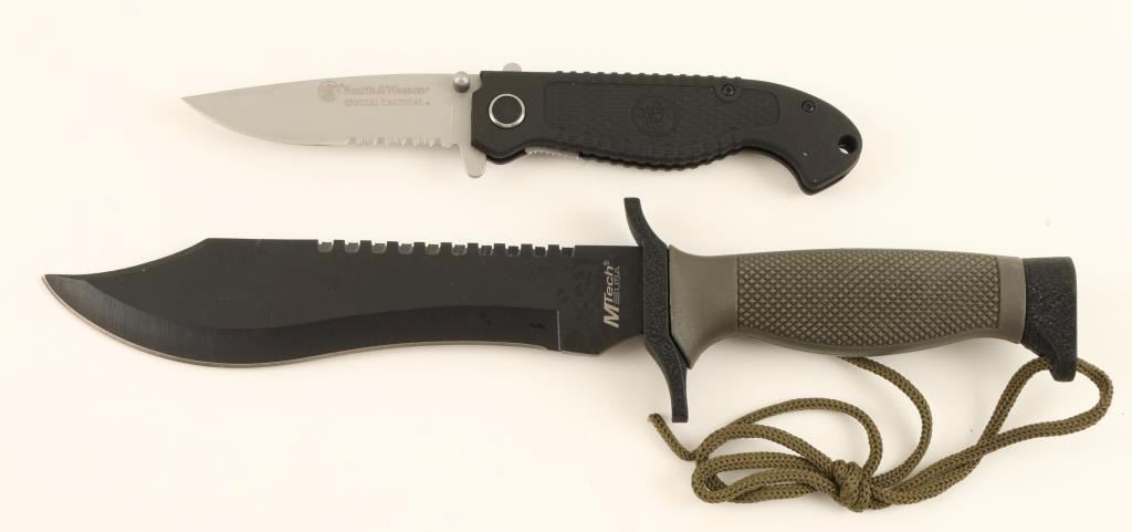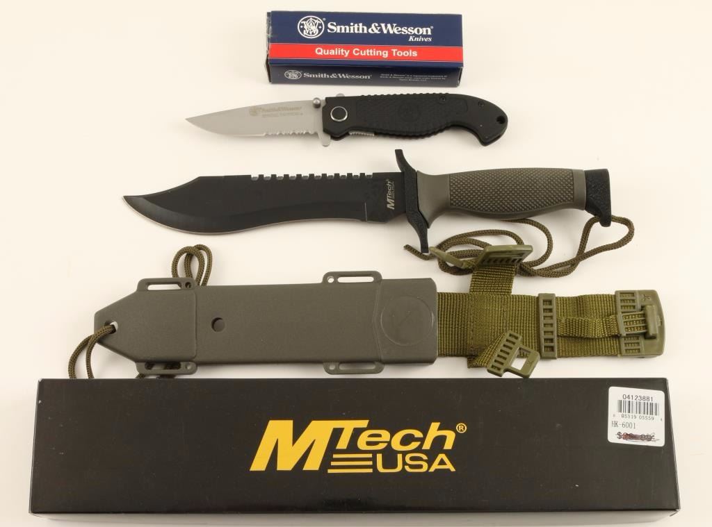 (1) MTECH Tactical Knife with Army green handle and sheath (1) Smith and Wesson Special Tatucal Pocket knife rubber handle with S&W logo CKTACSD model. Like new in boxes