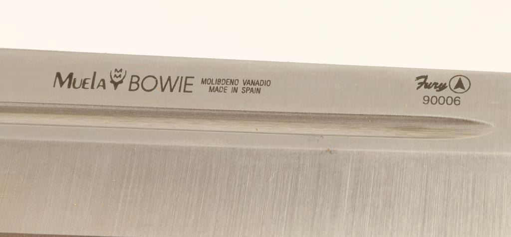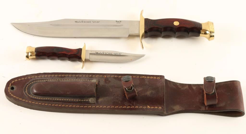 Wood handle with brass guard. Includes a small miniature bowie in leather knife sheath.