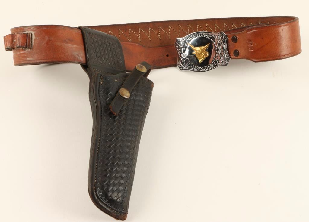 Consisting of (1) Black tooled leather belt loop holster maker marked by S.D. Myres of El Paso, Texas. Holster features basketweave tooling and is in good condition and shows age. & (1) Brown leather cartridge belt marked '38 L' and maker marked by Viking of Mexico. Belt has a steer head buckle and contains thirty-two loops capable of holding .45 caliber ammunition. Condition is fair to good as the belt shows age and has a few broken loops.