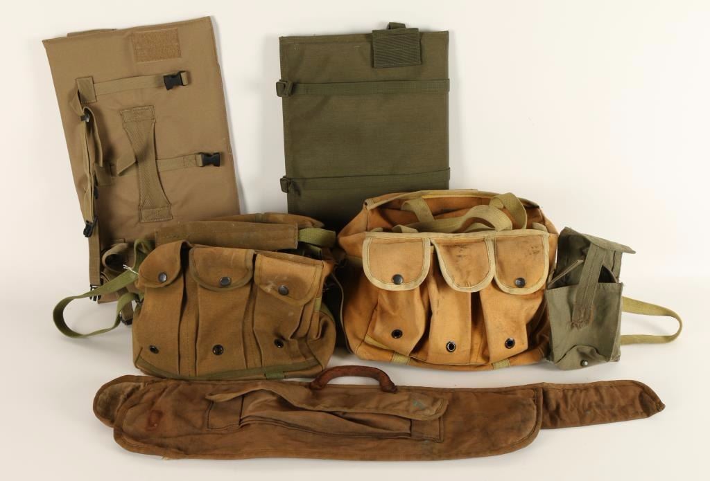 2 Ammo Bags, 1 Ammo Pouch, 1 Pouch With Leather Handle, all show use and wear, and 2 Other Nylon Accessories.