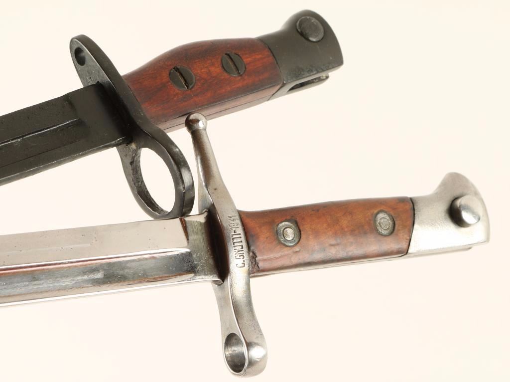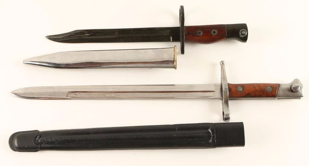Italian Carcano with leather scabbard which appears to have been added later and an FAL bayonet with a nickel plated scabbard that was added later.