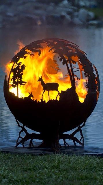 The Up North fire pit features a doe with her fawn in the north woods of Minnesota. The woods up north are what inspired this unique globe shaped sphere, designed by artist Melissa Crisp. The craggy tree branch legs are the base and are included. It is a wood burning fire pit made in the USA with American made steel, features a rust patina finish and has a rain drain at the bottom. This fire pit is 37 inches in diameter and has a Lifetime Warranty.