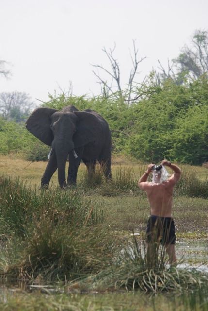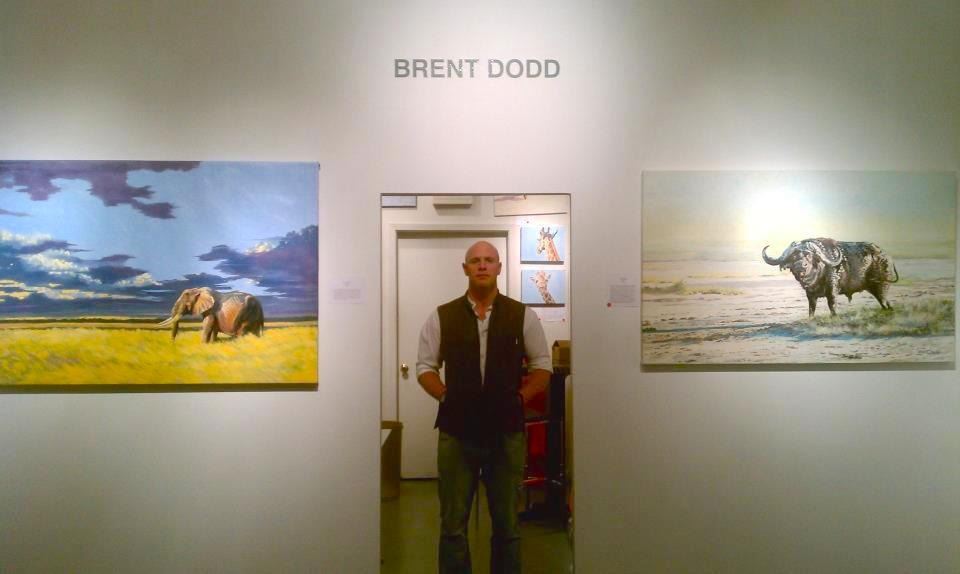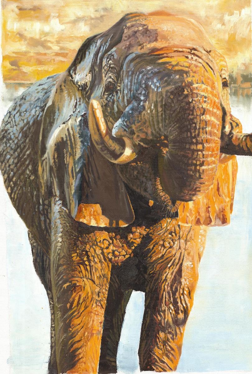 This elephant was painted in Brent’s studio in the Okavango Delta of Botswana’s northern plains. The elephants come down to the water in the evenings to drink and bathe. Once they’ve drunk up to 44 gallons of water in one go they set about spraying water over their entire bodies with their trunks. Thereafter they spray sand and dust over themselves, which sticks to the wet skin, and this sandy outer coating protects them from the sun, helping to keep them cool during the hot African days. The water and sand process is much like a Skin Care Regime. The painting contrasts the wet appearance of his skin, yellow light against the cool blue and purple light of shadow, capturing the moisturizing process just before he dusts himself over. We can draw all sorts of analogies from this, about how we prepare ourselves for the world around us, its elements and its realities.