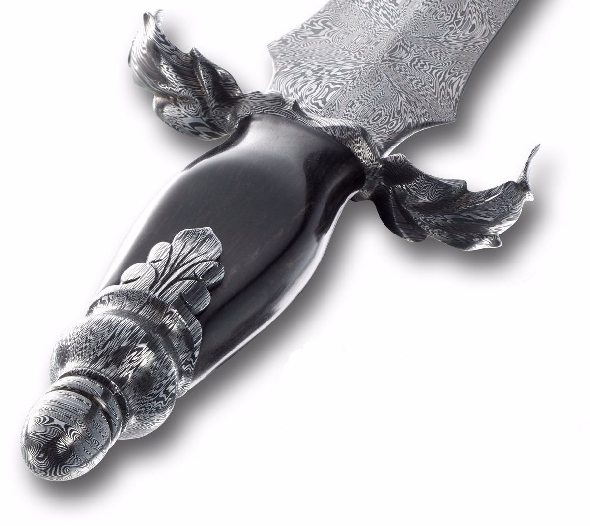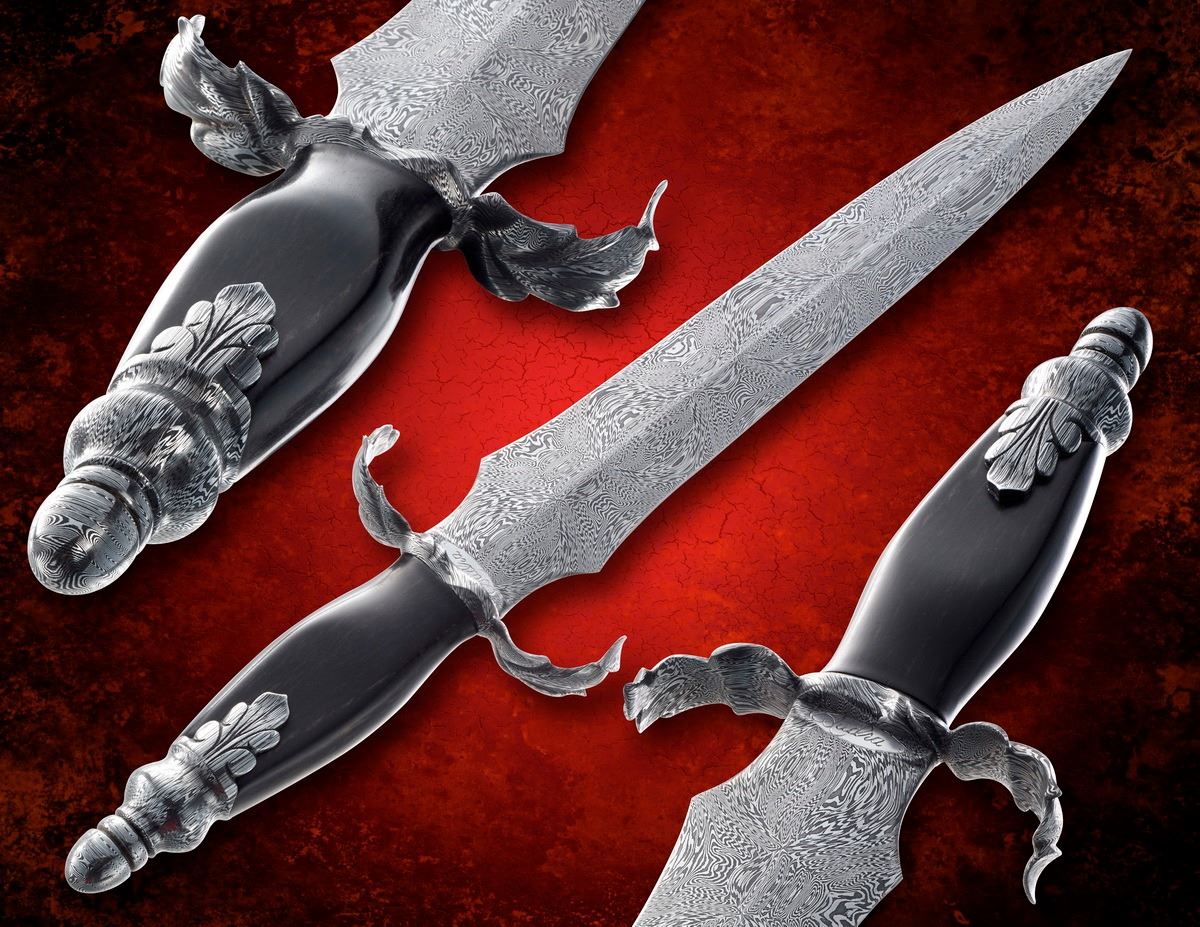 Knife Rights’ Liberty's Steel™ II - Fires of Perseverance™ is a stunning one-of-a-kind 16.75-inch Damascus dagger by the world's first woman ABS Master Smith, Audra Draper. The dagger was conceived and sponsored by Knife Rights expressly for the NRA's Women's Leadership Forum Auction. It features a 11.25-inch double-edged blade forged into a distinctive and historic shape symbolizing courage and daring. Audra's trademark leaves on the 4-inch guard and pommel symbolize the celebration and promise of new life, and the carved Damascus leaves that surround and embrace the blade and handle represent us all protecting and embracing our freedoms. Lady Liberty's Steel™ II - Fires of Perseverance™ is presented in a custom-built walnut display case by master craftsman Michael Zieba of Zieba New York located in Brooklyn, New York. It features glass on four sides and the top and a composite concrete and brass base.