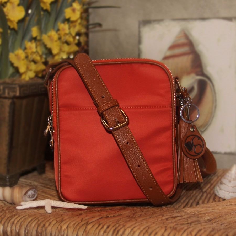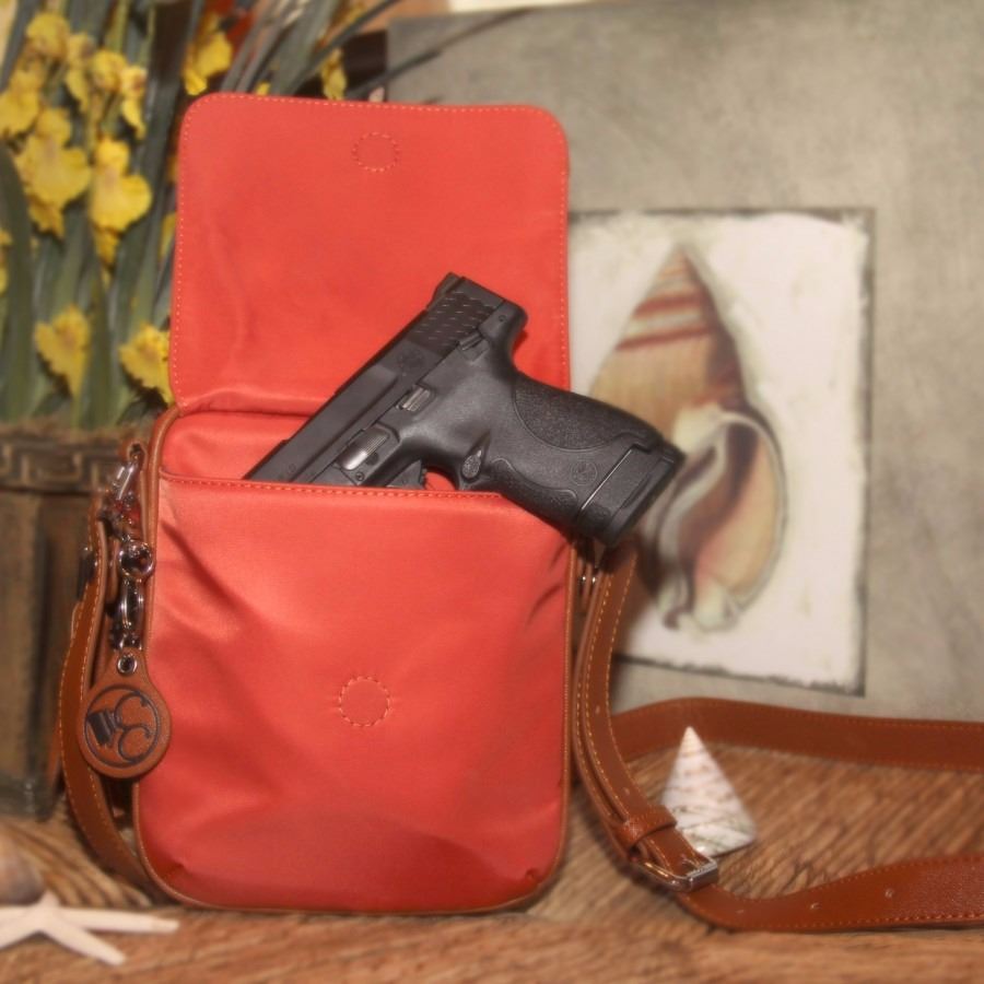The Casual Carrie lightweight microfiber crossbody handbag features brown synthetic leather trim and is designed to maximize function and space. The unique compact design includes a discreetly hidden ambidextrous exterior firearm compartment with magnetic closure for quick easy access. The main compartment offers storage pockets with additional room for personal items. Discreet exterior cellular phone pocket allows for quick easy retrieval. The removable shoulder strap easily adjusts up to 52 for crossbody comfort. All Concealed Carrie handbags come with a Concealed Carrie key chain and fashion tassel. This handbag best accommodates any compact or sub-compact handgun and can also securely hold tasers, stun guns, pepper sprays and like forms of non-lethal self-defense products. This bag includes a removable, adjustable holster.