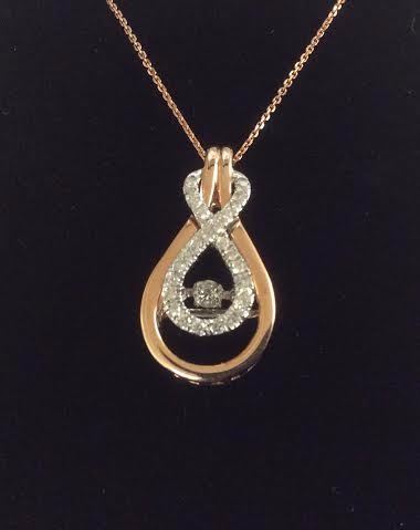 Lot 18: Beautiful Dancing Diamond Pendant - This 14 carat gold pendant holds 27 diamonds .20ct total weight. Included is an 18" 14 carat rose gold chain.