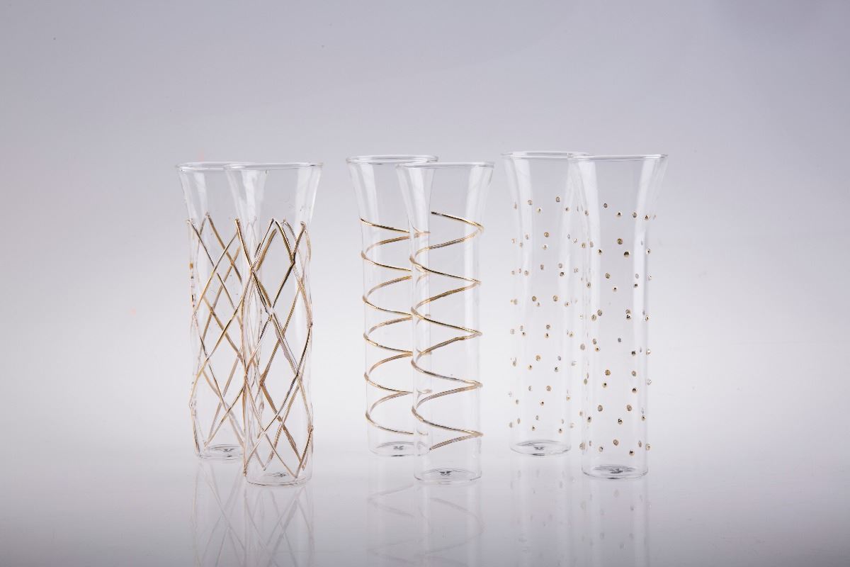 These exquisite champagne flutes sparkle even before you fill them. Each glass has its own charming personality in elegant swirls, raised dots, and gold accents. Light and delicate in your hand, but ready for frequent toasts and celebrations.