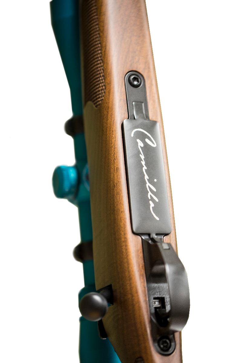 NEW FOR 2016: Vanguard Camilla Rifle. Designed specifically for women by a select team of women hunters and shooters. And just for the NRA Women's Leadership Forum, Weatherby custom engraved the floor plate with Camilla Weatherby's signature and partnered with Leopold to mount a VX3i 3.5-10x40 scope in an anodized teal color with CDS dial and Windplex reticle. This speciality Camilla comes in the popular caliber .243 WIN.