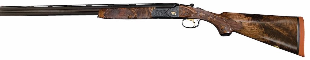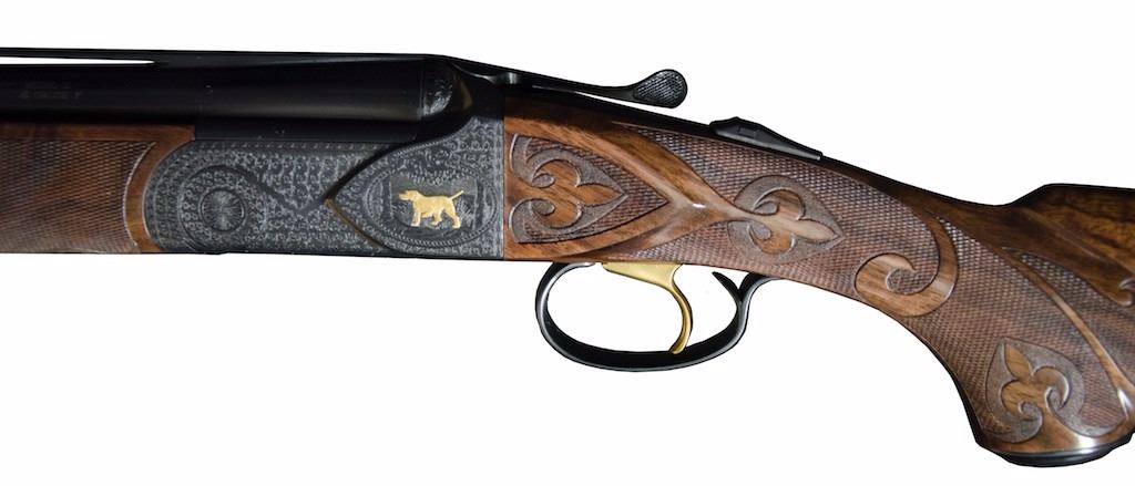 This unique firearm comes equipped with an exhibition-grade black American walnut stock and leather pad. The receiver has raised side panels like Winchester model 21 and gold inlays of a pointer on one side, a setter on other side, two pheasants on the bottom, and a Labrador retriever bust on trigger guard. It has Grand American scroll engraving just like Winchester model 21 Grand American and the receiver is deep blued just like Winchester 21, 12, or 42, which really brings out the inlays. It has a feather crotch American black walnut stock and forend with b-carve checkering, single selective trigger, automatic ejectors, automatic safety, and ventilated rib. It comes with a deluxe case.