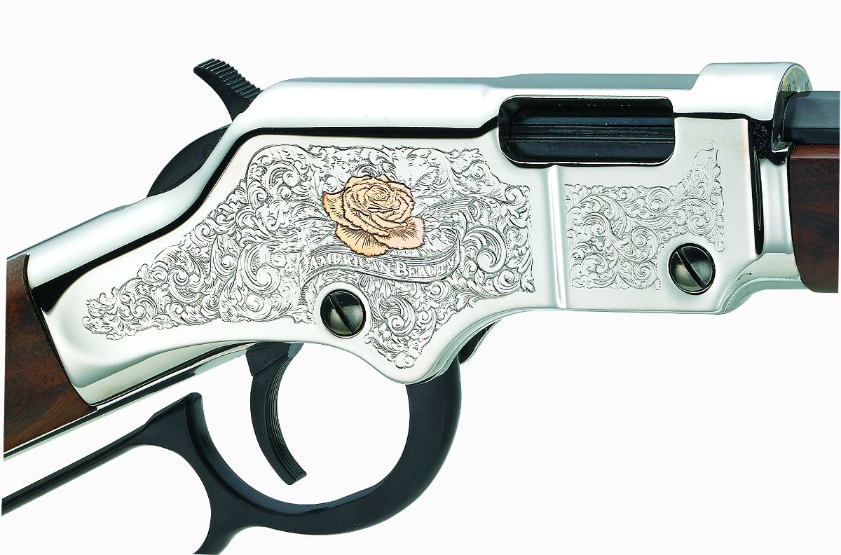Once you see Henry Repeating Arms’ American Beauty rifle you’ll be asking yourself, “who says diamonds are a girl’s best friend?” Named after the iconic American Beauty Rose, this rifle was designed with the highest attention to detail and beauty. The main panel features rose embellished with a floral scroll pattern. Beneath the rose is the banner AMERICAN BEAUTY. Hand-cut by master engraver Heidi Roos, the rose and other elements are mechanically transferred onto the nickel plated receiver cover using a hand cut master. This meticulous process helps retain the bright cuts of the original art, which is then further enhanced with 14K rose gold plating so the petals look like they’re in bloom. Lever Action .22 S/L/LR.
