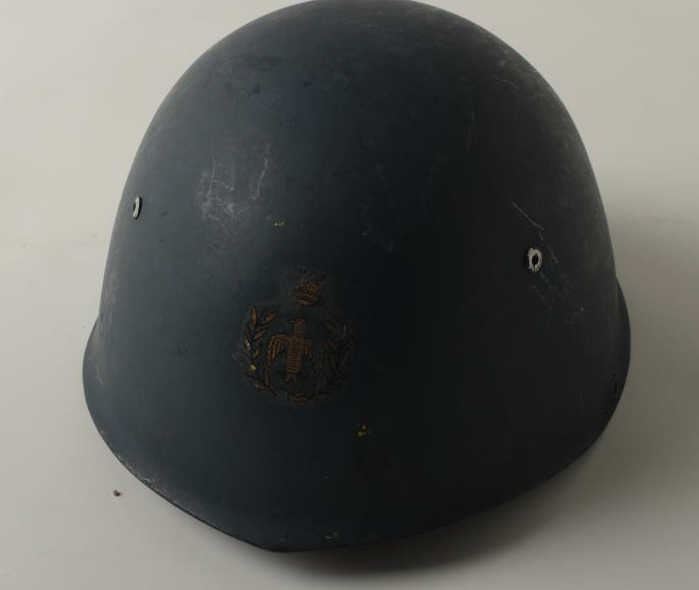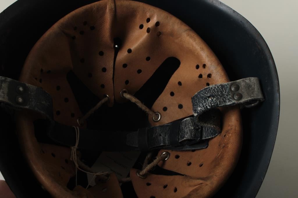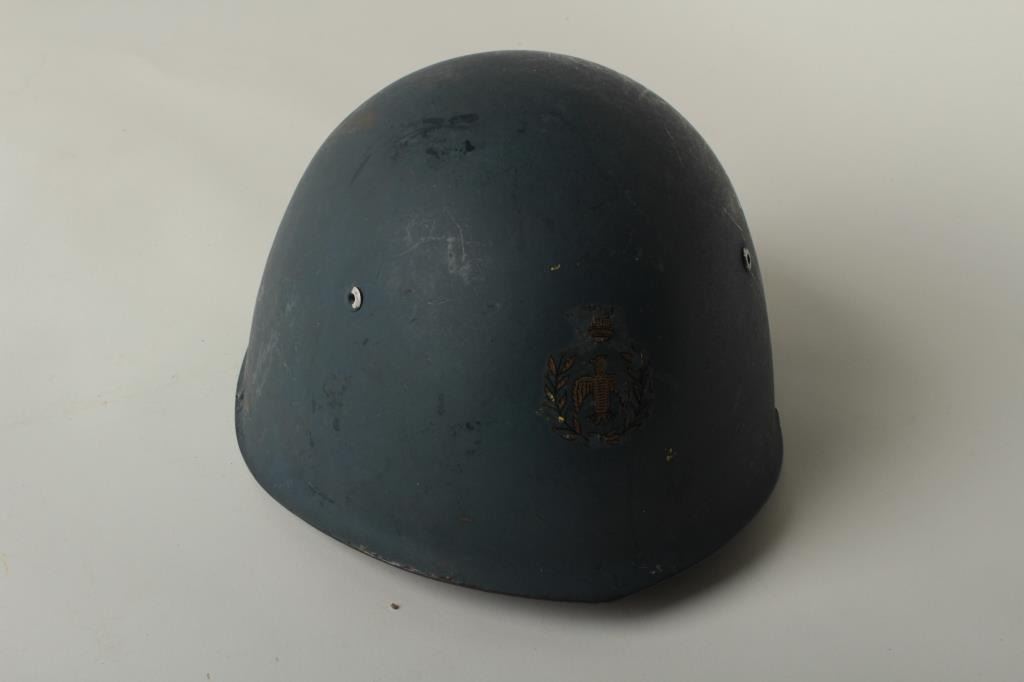 Italian WW II era Model 1933 Regia Aeronautica (Luftwaffe of Italy) metal helmet in very good condition with liner, chin strap and majority of front insignia intact as well as the majority of original blue paint finish. Est.: $100-$200.