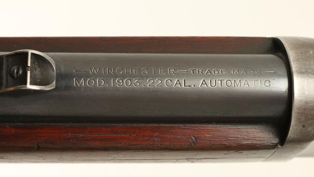 Winchester Model 1903 semi-automatic rifle, .22 caliber, 20” round barrel, S/N 20406, blued finish, wood stocks in overall very good + condition showing the majority of its original finish with high point wear from carry; very goodbore, action, markings and wood. (C&R). Est.: $300-$500.