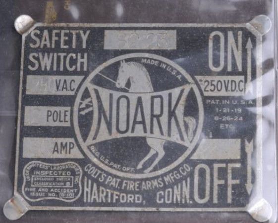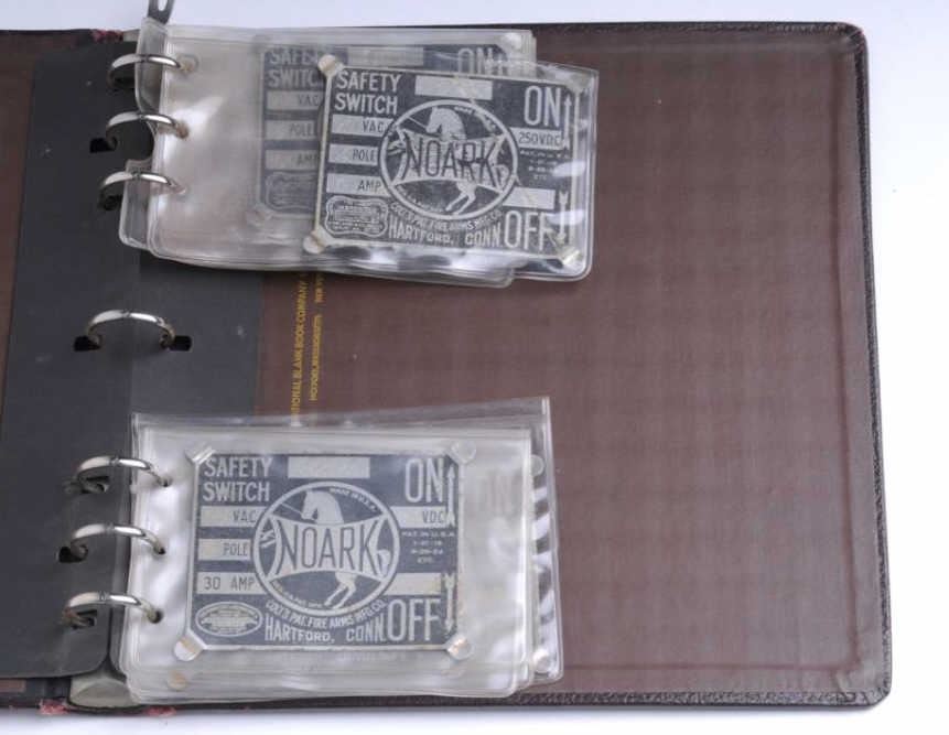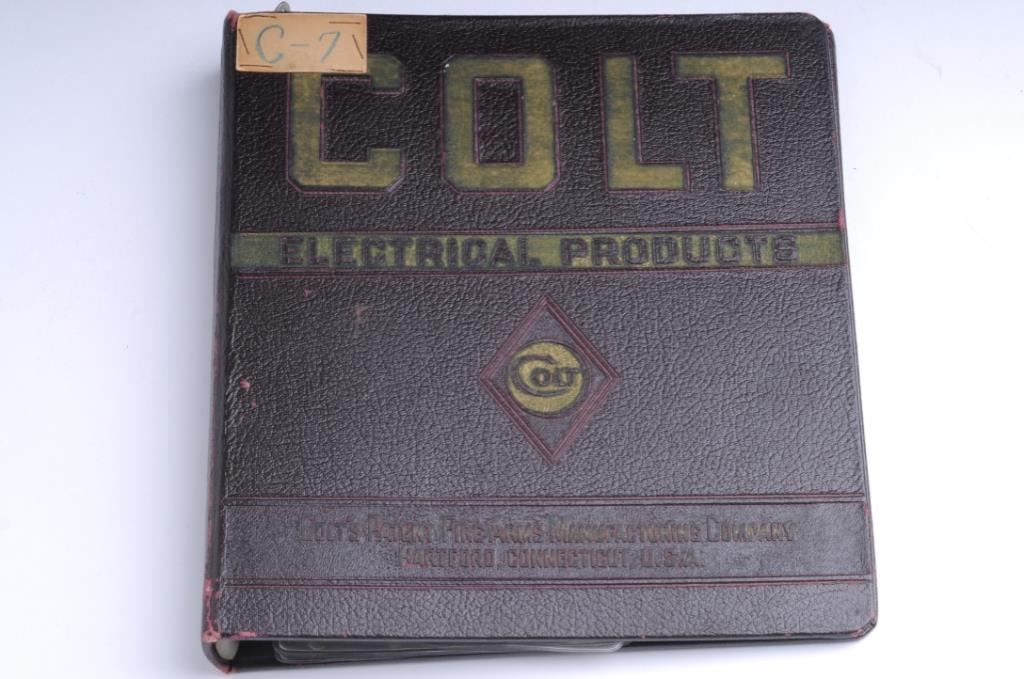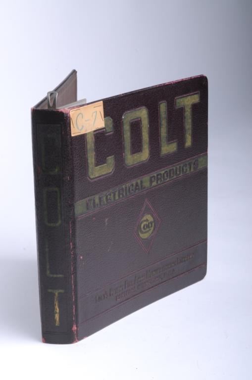 Original Colt Firearms Manufacturing Co. salesman’s 7-ring hard cover binder containing 9 safety switch metal tags for electrical service panels; appears to be ca. 1930’s-40’s; Colt was involved with marketing non-gun items over theyears and this is a great group of Colt ephemera. Est.: $100-$200.