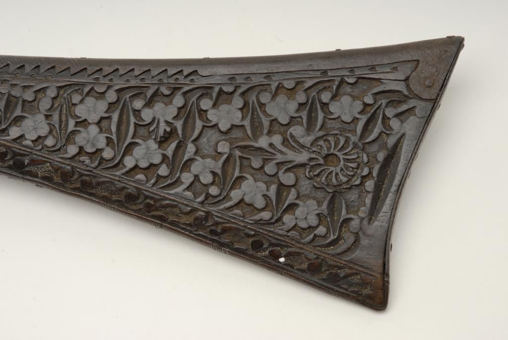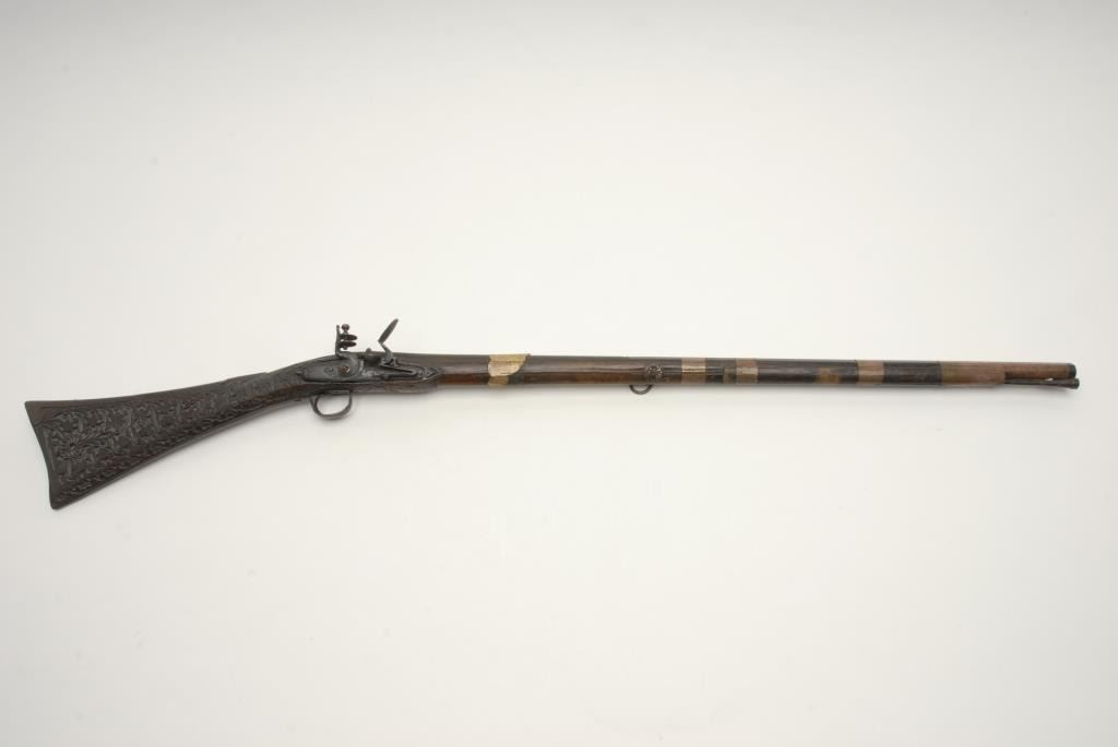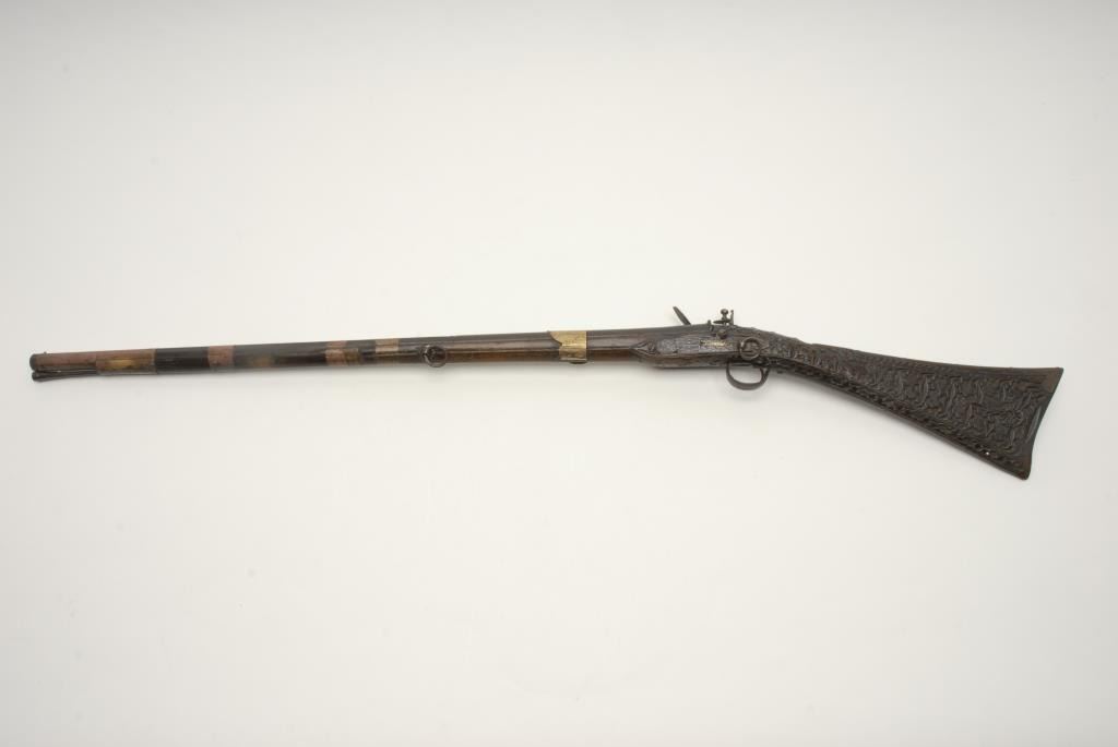 Turkish or Caucasian flintlock carbine with fancy carved stock and brass and copper bands. The carving in the stock is similar to the 19th century furniture found in Turkish places. Brown patina. Circa 1800’s. In good condition with rearband damaged. Est.: $800-$1600