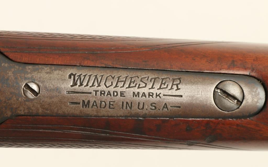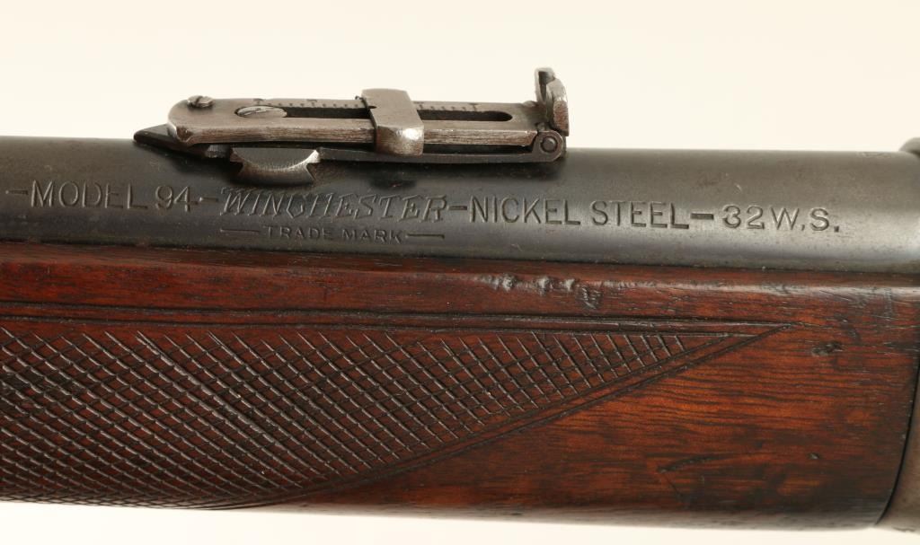 Winchester Model 94 lever action SRC, .32 W.S. caliber, 20” barrel, S/N 1034224, blued finish, wood stocks with non-factory old checkering in overall very good condition showing considerable original blue on the barrel assembly and traces of original blue in protected areas of the receiver, very good bore, crisp action, sharp markings and very good stocks. (C&R). Est.: $400-$800.
