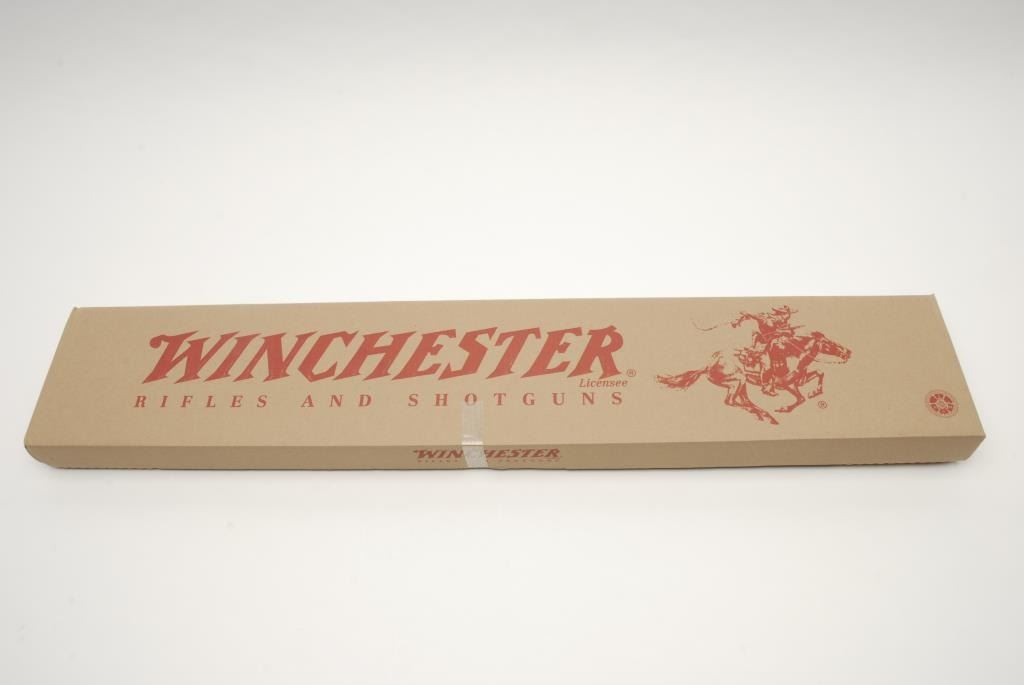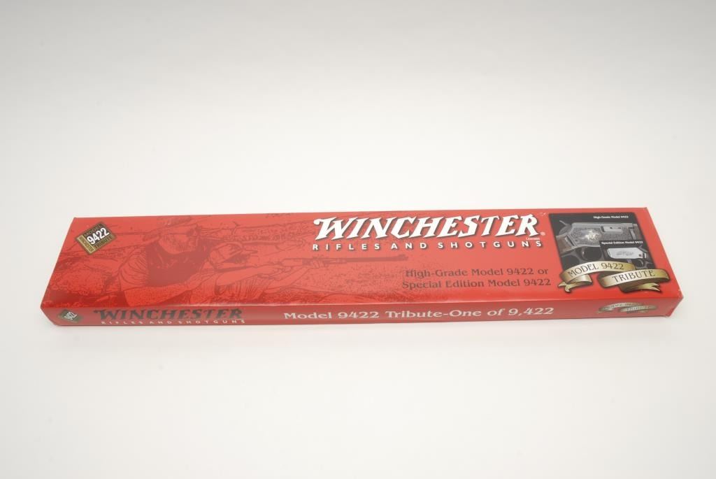 Winchester Model 9422 Legacy Special Edition lever action rifle, .22 Long Rifle cal., serial #FTS9181. The rifle is in as new in the box condition showing only handling and little to no use. The rifle has a 22” blued, round barrel with a hooded front sight. The receiver is blued with the Winchester cowboy on horseback stamped on the side. The checkered wood stocks are as new with a smooth rubber butt pad. In the original factory box with sleeve, Winchester shipping boxand all associated packing material, accessories. This rifle was one of the last produced at the New Haven CT. plant that closed in 2006. Est.: $350-$700. (Modern).