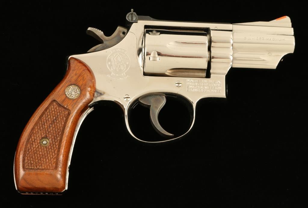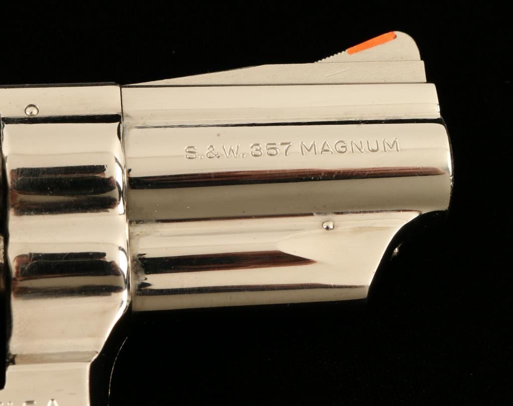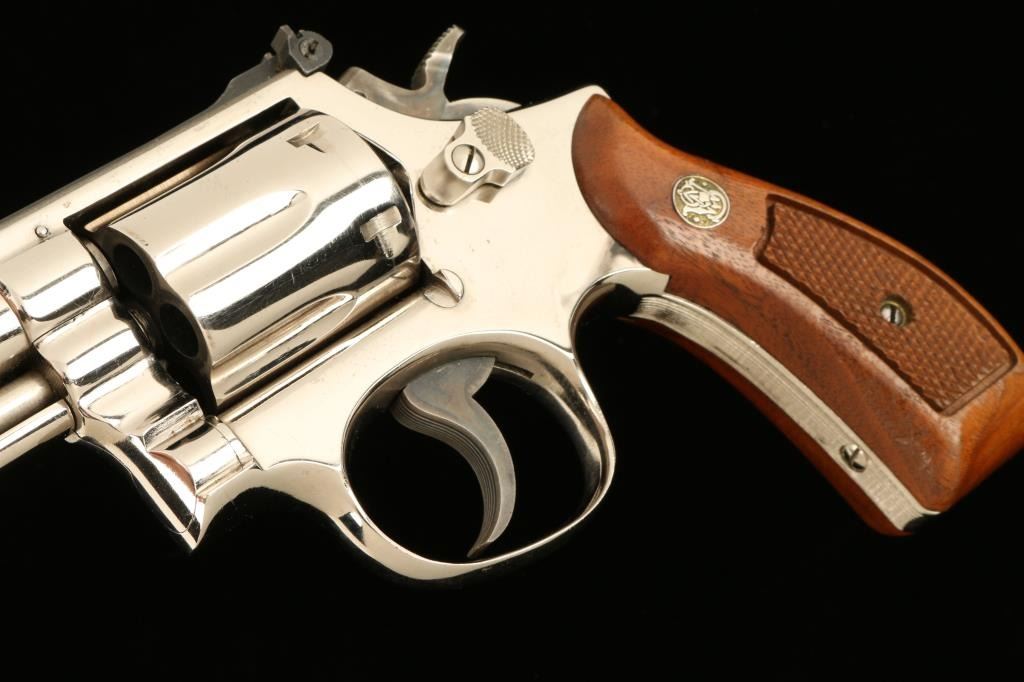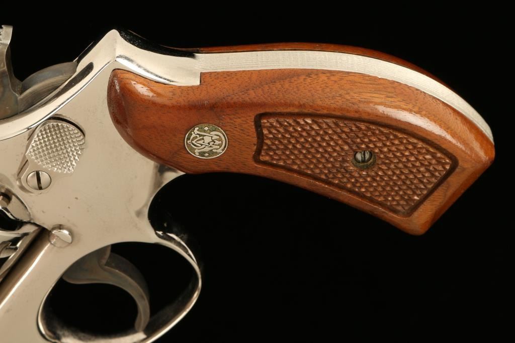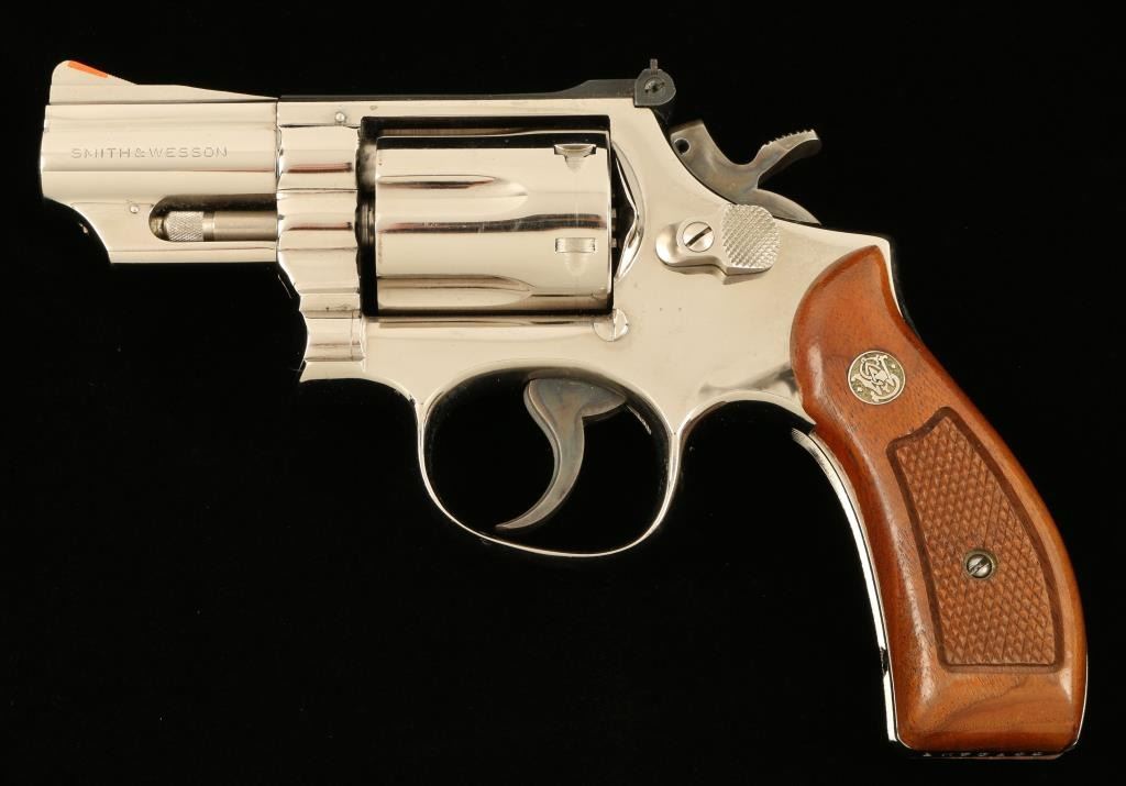 Lot 80 Smith & Wesson Model 19-3 DA revolver, 2.5” barrel, S/N 1K53133, nickel finish, checkered wood med
