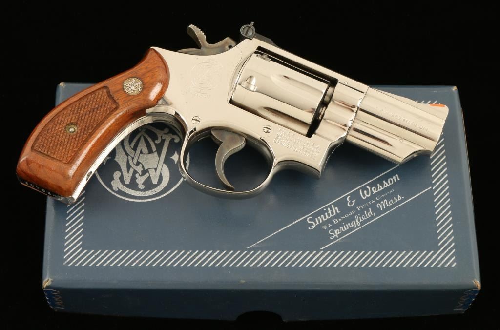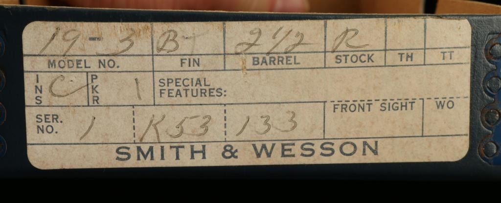 Smith & Wesson Model 19-3 DA revolver, 2.5” barrel, S/N 1K53133, nickel finish, checkered wood medallion grips and accompanied by factory cardboard box with end label numbered to this gun. This revolver is in overall very good to finecondition with a crisp action, sharp markings, very good to fine bore and fine grips. The box is also very good and contains cleaning tools and factory paperwork. (PPT). Est.: $500-$1,000.
