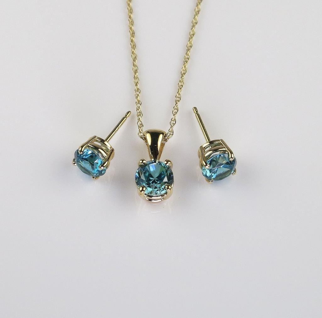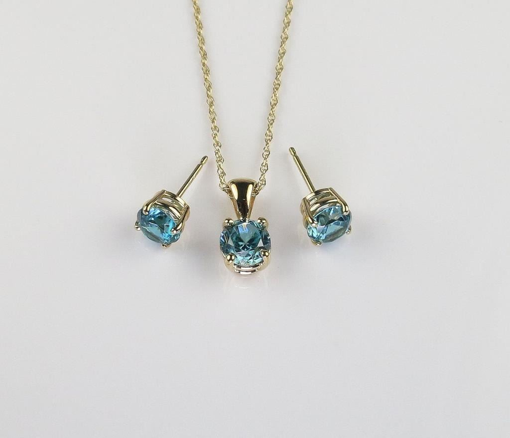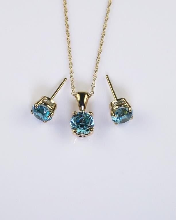 Brilliant Blue Zircon 3 Piece Matching Set - Pendant and Pair of Stud Earrings 3 round cut bright blue zircon weighing 4.05 total set in 14 karat yellow gold. Retail $1,000-$1,200 Estimate $500-$700