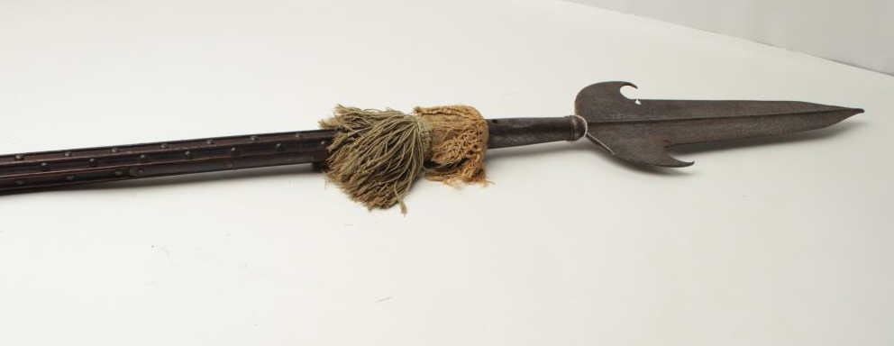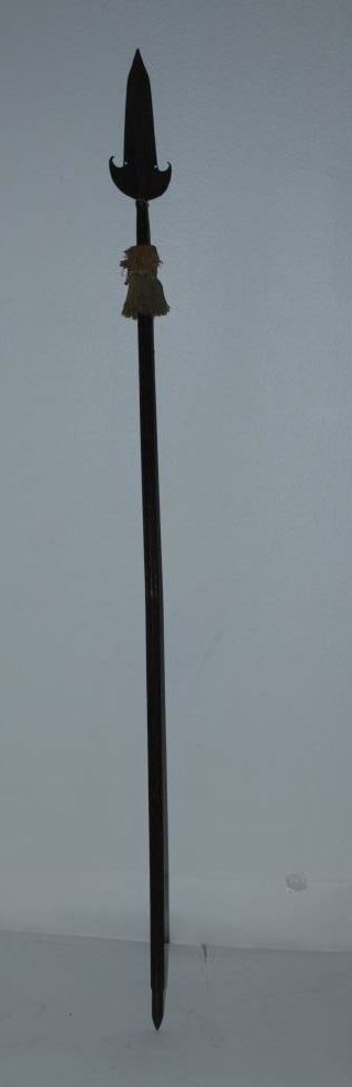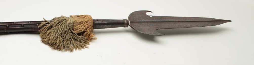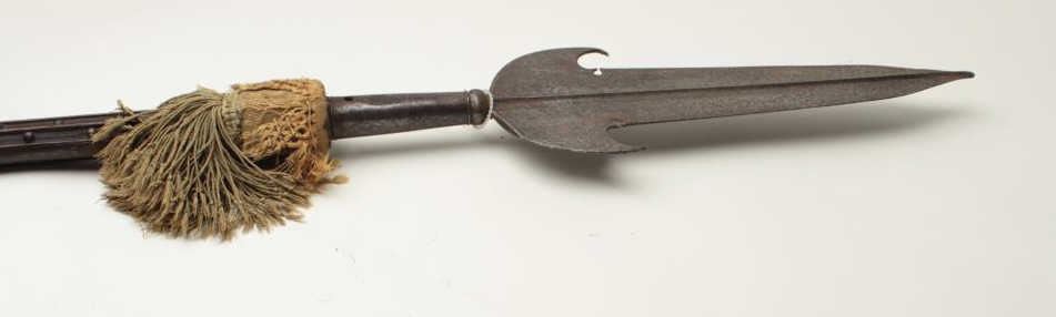 European polearm probably Italian circa 16th to 17th century on original brass studded shaft with silk braided orange and green fringe. The blade measures 18 ½” in length by 6” across widest part. The weapon measures almost 85” from tip to end.The condition is very good and “As found”. The blade is quality made with raised median ridges and no marks. Est.: $1,000-$2,000
