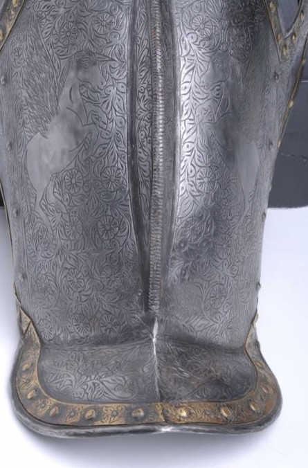 Chanfron or horse armour from area of India or region. Well and properly constructed with decorative etching and quality metal work. 19th to early 20th century for parade. Measures 24” from end to end. Nicely engraved unicorns on the twofront panels. Though not an early battle armour a very nice and decorative chanfron that has a bit of age. Est.: $1500-$3000