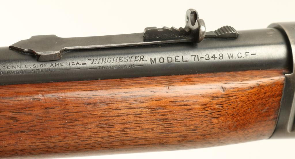 Winchester Model 71 lever action rifle, .348 W.C.F. caliber, 24” round barrel, S/N 27735, blued finish, wood stocks in overall very good to near fine condition displaying the majority of its original blue finish to metal surfaces, very goodto fine bore, crisp action, sharp markings and very good wood stocks (some wear to finish of butt stock and minor old mars from storage). (C&R). Est.: $1,400-$2,800.