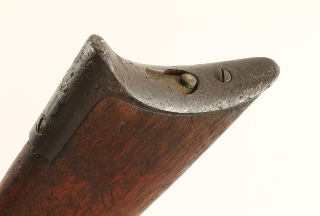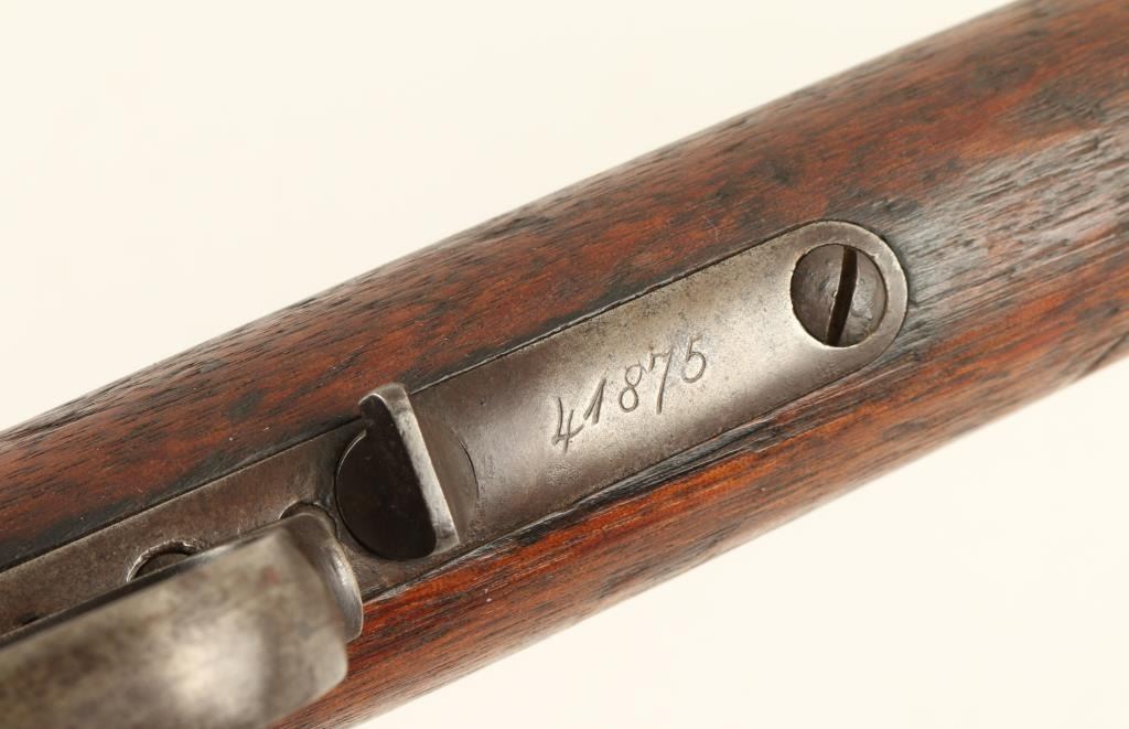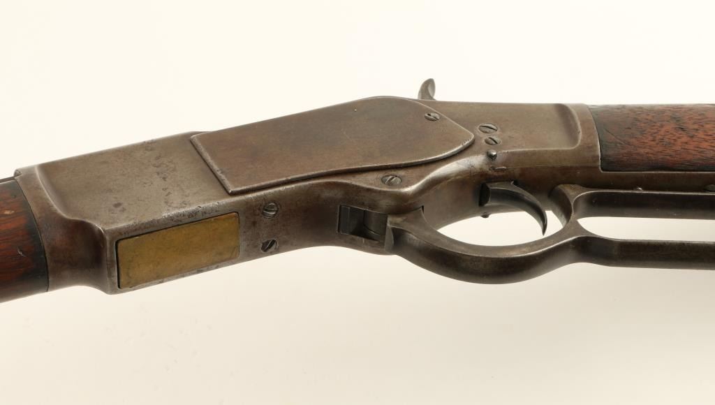 Winchester Model 1873 lever action rifle, .44 W.C.F. caliber, 28” octagon barrel, S/N 41875, blued finish, wood stocks in overall good to very good condition showing a pleasing brown patina to metal surfaces, crisp action, good markings; boremay clean to good; missing dust cover; old pitting to iron butt plate; stocks show weathering and scattered old mars and scratches from carry and storage. (Antique). Est.: $1,400-$2,800.