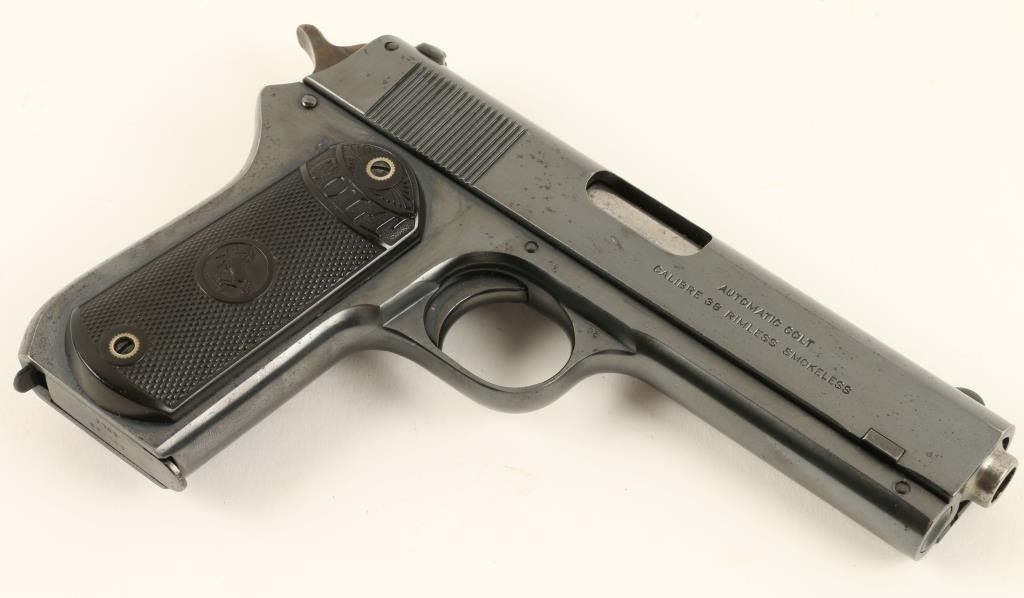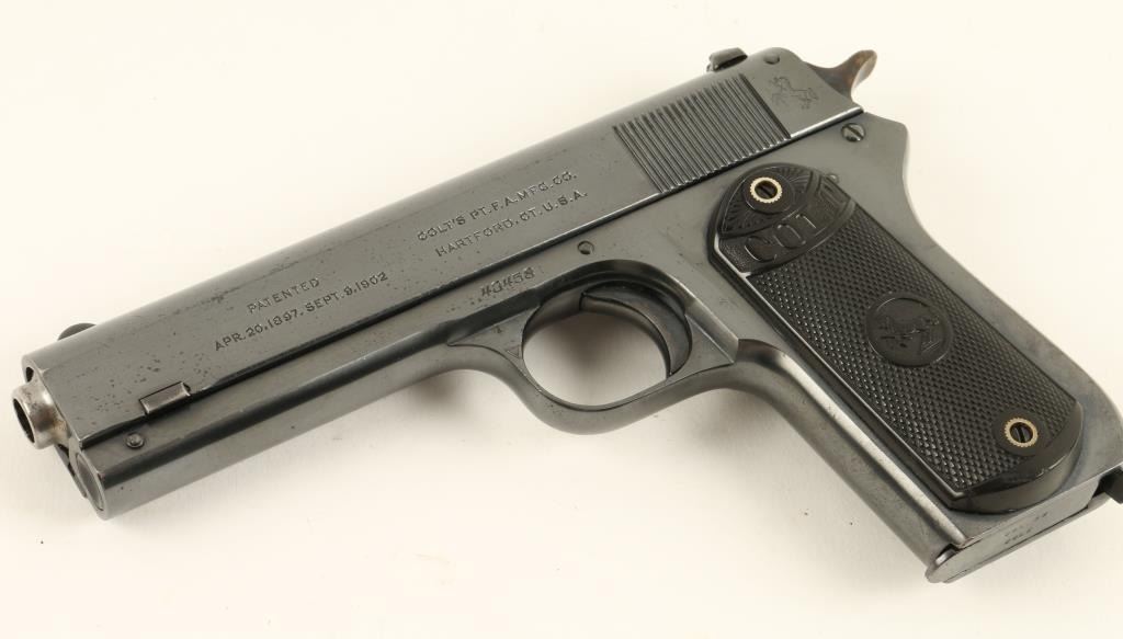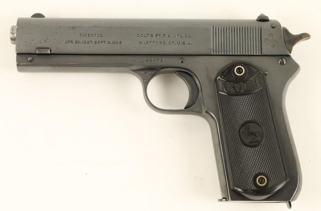 Colt Model 1902 Pocket semi-automatic pistol, .38 caliber, 4.5” barrel, S/N 43458, blued finish, checkered hard rubber grips in overall fine condition displaying the majority of its original blue finish, sharp markings, crisp action and fine grips. Accompanied by factory instructions sheet. (C&R). Est.: $1,500-$3,000.