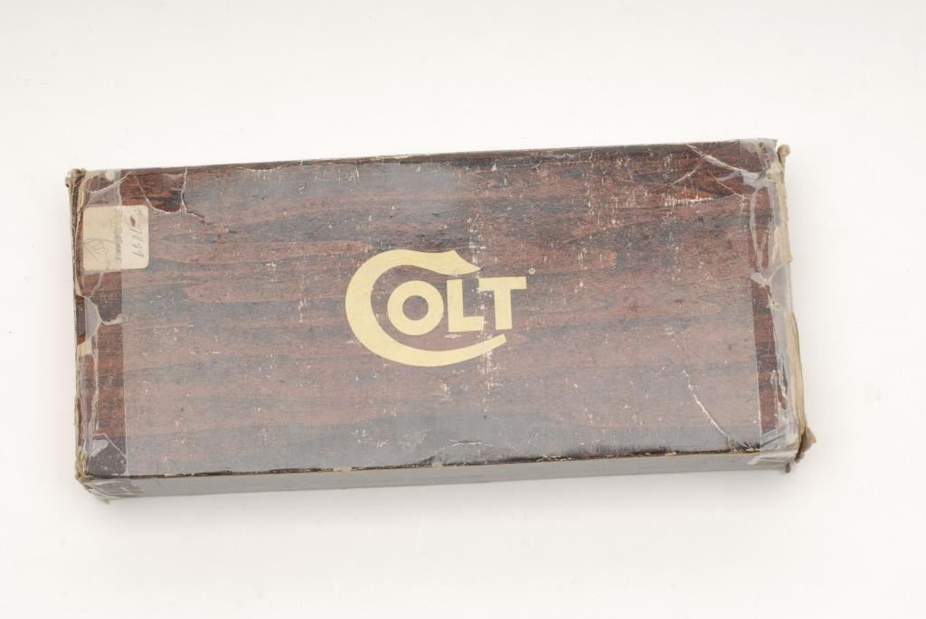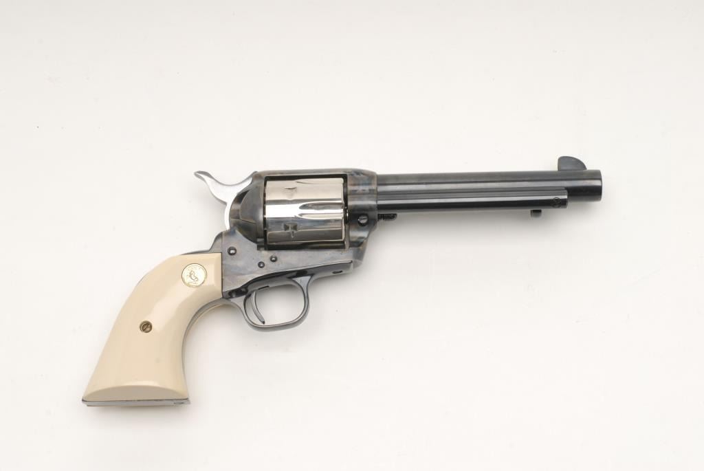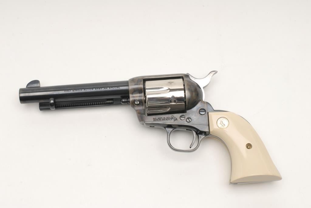 Colt 3rd Generation SAA revolver, .44 Special caliber, 5.5” barrel, S/N SA62255, in overall like new condition with blued barrel assembly and straps; nickeled cylinder and case hardened frame; factory ivory composite Colt gold medalliongrips; with hang tag and wood grained factory box with Styrofoam inserts. (C&R/PPT). Est.: $1,600-$3,200.