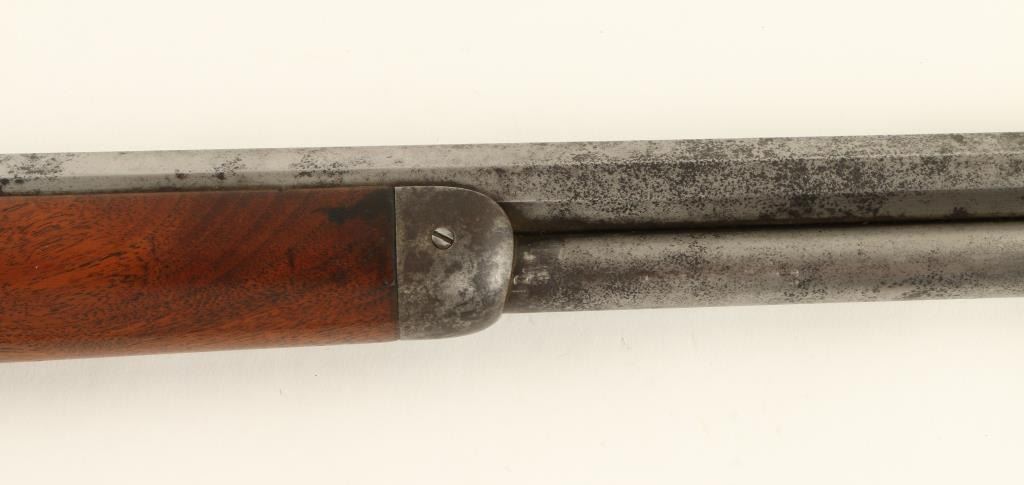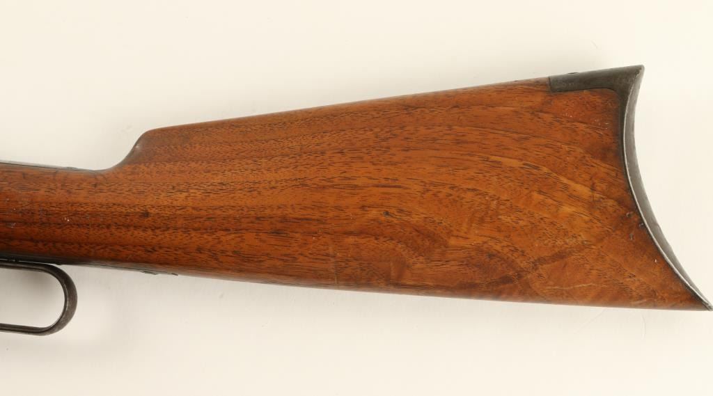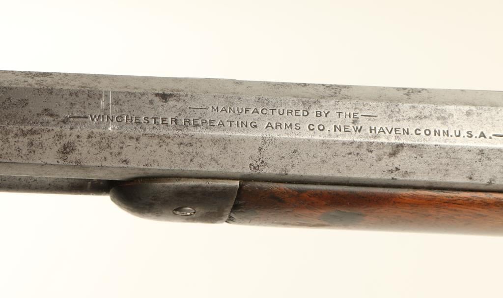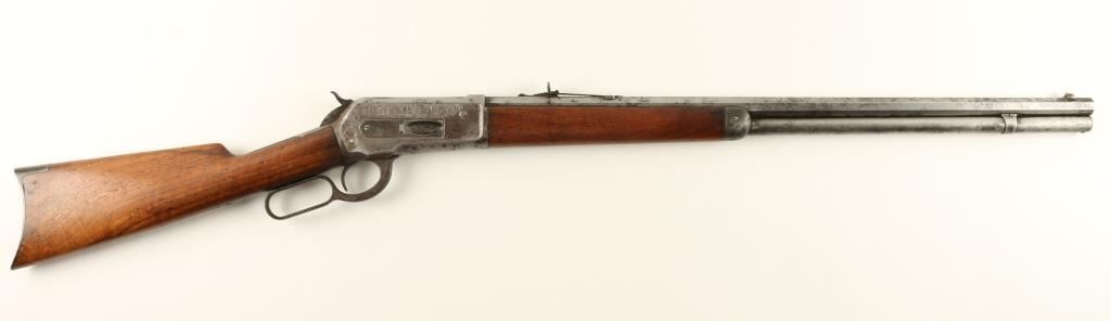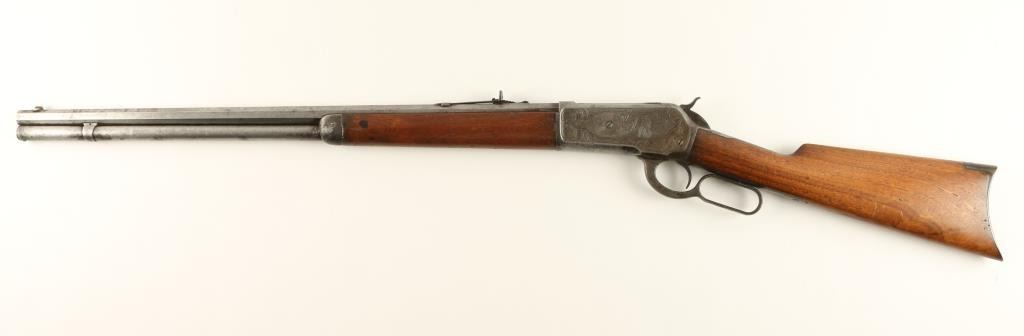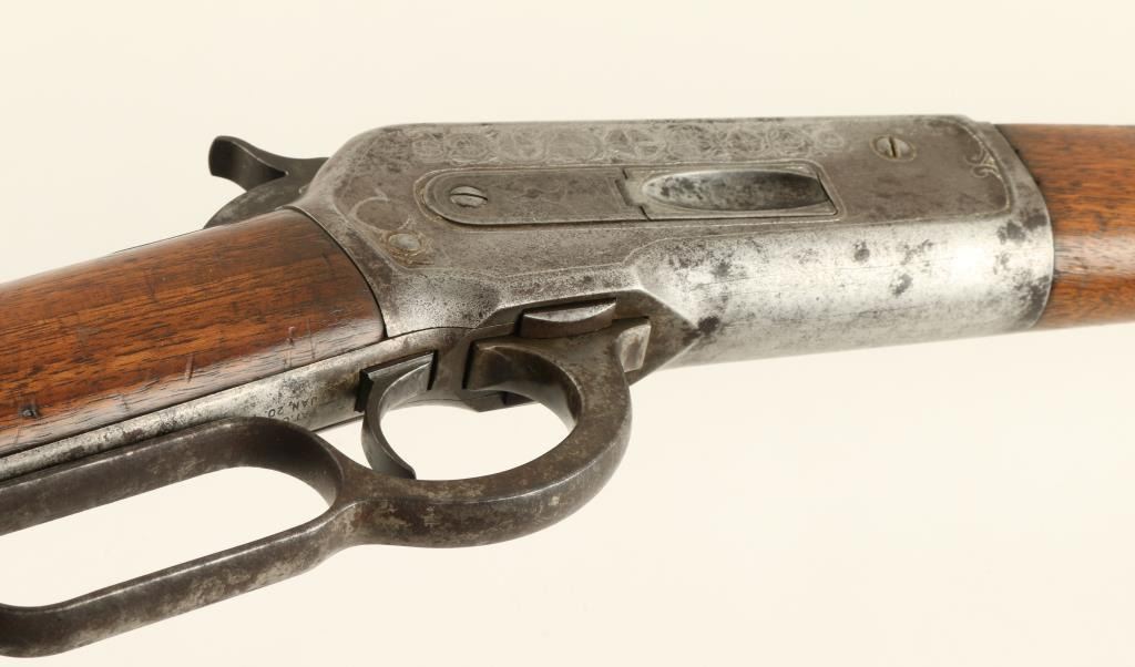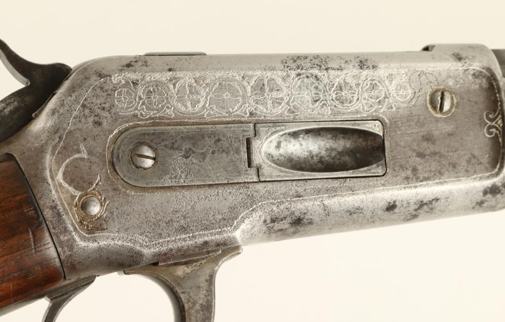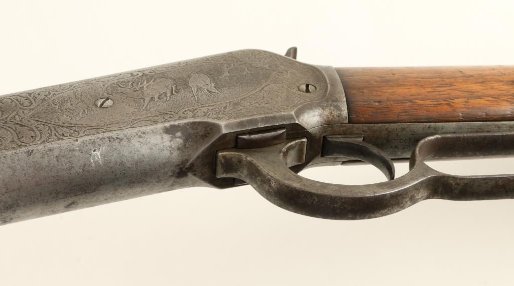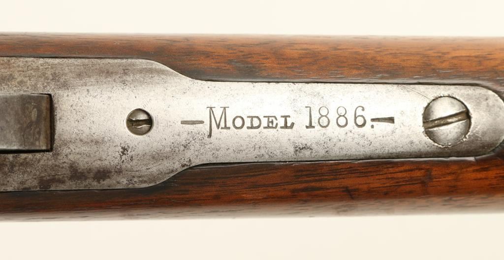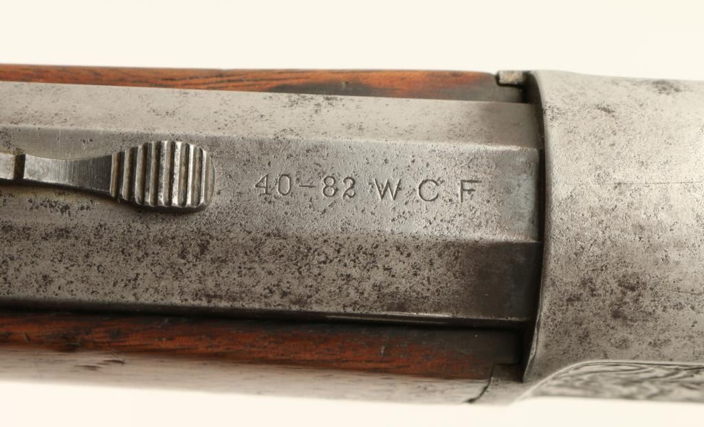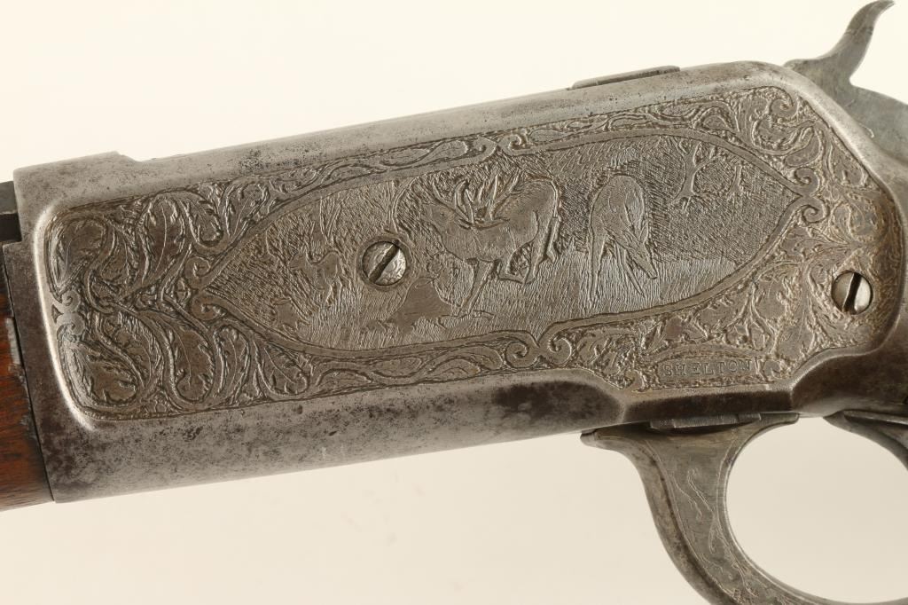 Winchester Model 1886 lever action rifle with non-factory old period engraving on receiver, .40-82 W.C.F. caliber, 26” octagon barrel, S/N 124309, grey patina, wood stocks in overall good condition showing a grey patina to metal surfaceswith scattered spots of erosion and areas of light to moderate pitting; fair bore, crisp action, good markings and overall good wood with some scattered old mars and scratches from carry and storage. Engraving includes floral designs, apanel game scene on the left side of the receiver and the name “SHELTON” also engraved on the left side of the receiver (engraver or a previous owner?). (C&R). Est.: $1,750-$3,500.
