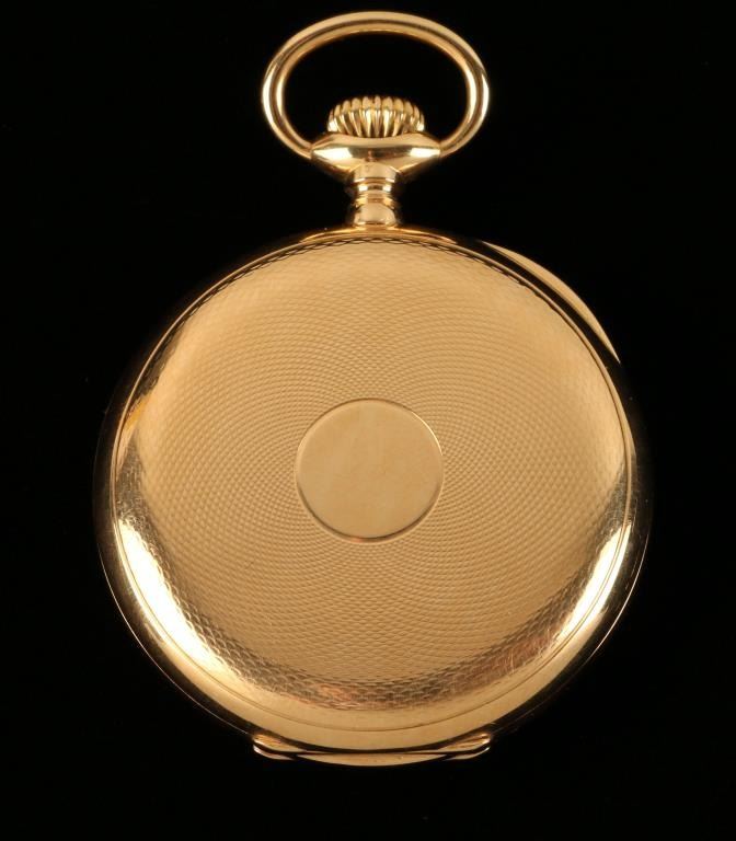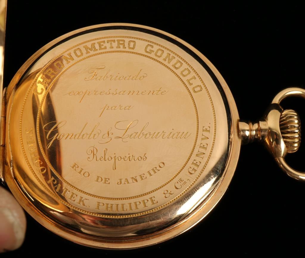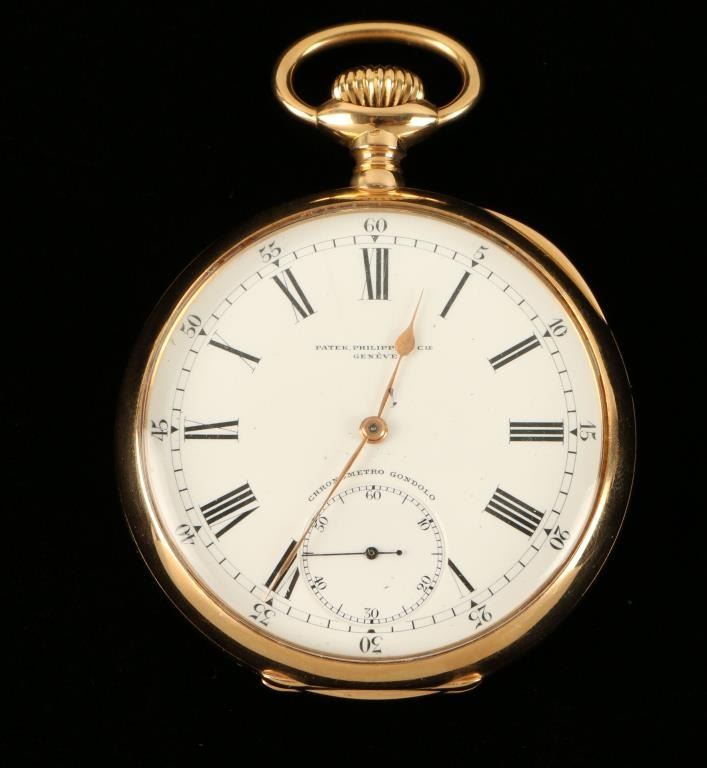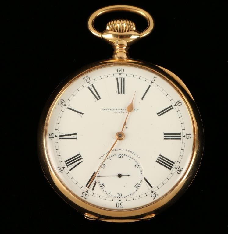 Outstanding 18K gold open face pocket watch by Patek Philippe with fine face, approximately 2.25” in diameter. Interior back cover is inscribed “CHRONOMETRO GONDOLO; Fabricado expressamente para Gondolo & Labouriau, Relogoeiros RIO DE JANEIRO;No 161160, PATEK PHILIPPE & Cie, GENEVE”. Running at time of description. Est.: $2,500-$5,000.