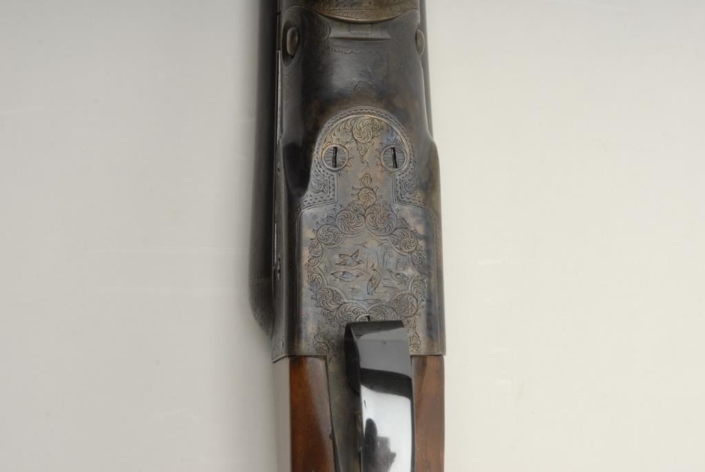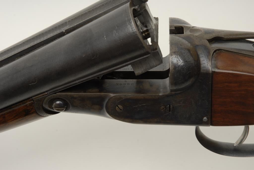 Parker D grade SxS 12GA Damascus steel shotgun, S/N 79990. Refinished and restocked by Pachmeyer and showing 26 ½” barrels choked open or cylinder. A very nice stocking and would be a good field gun. (C&R) Est.: $900-$1800