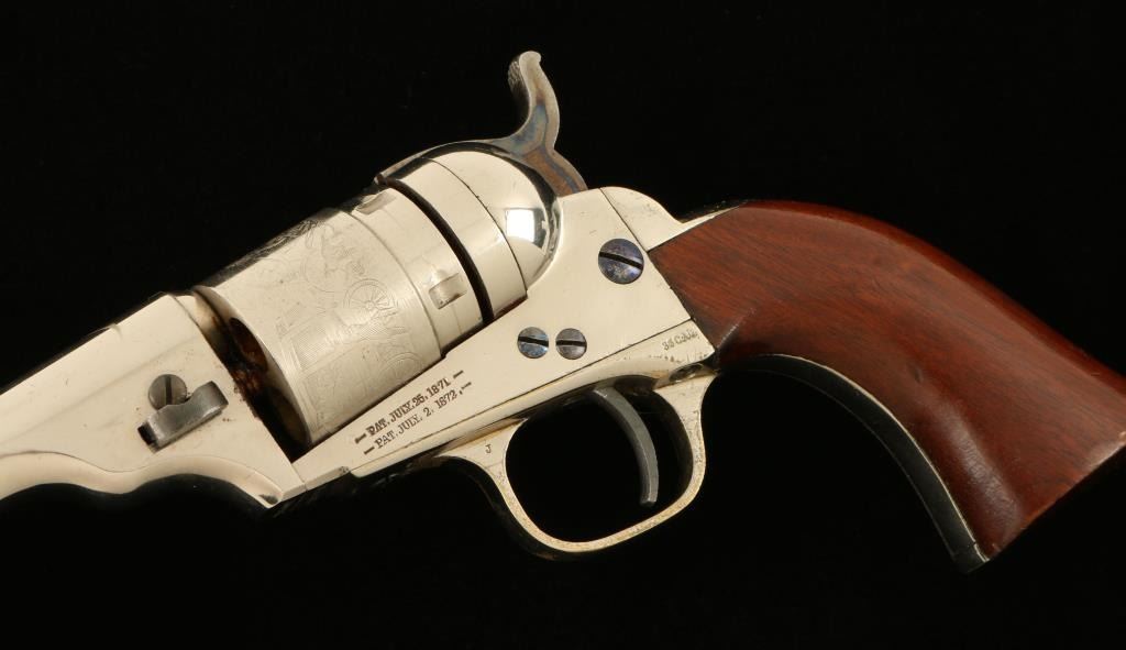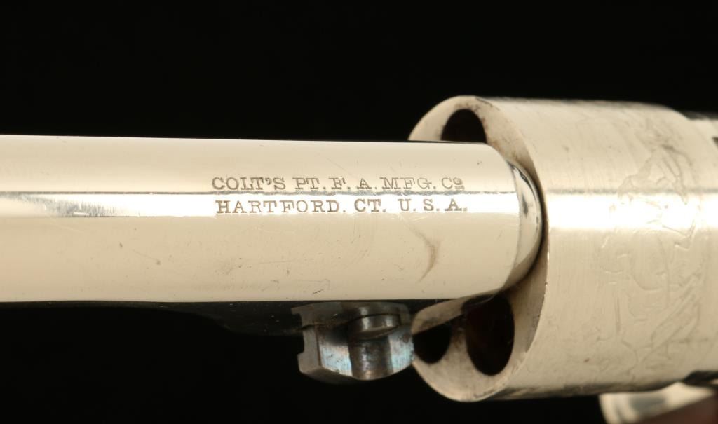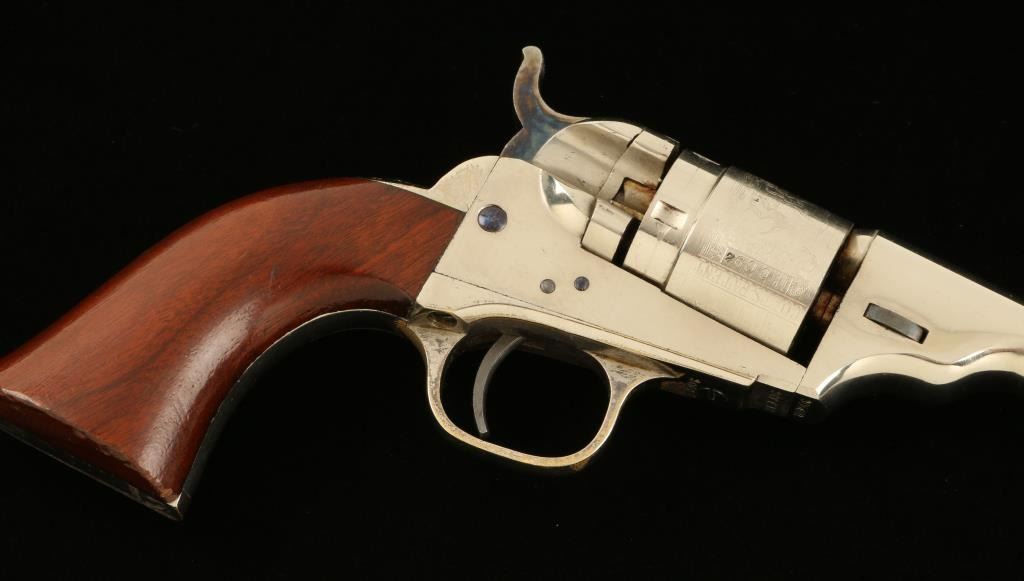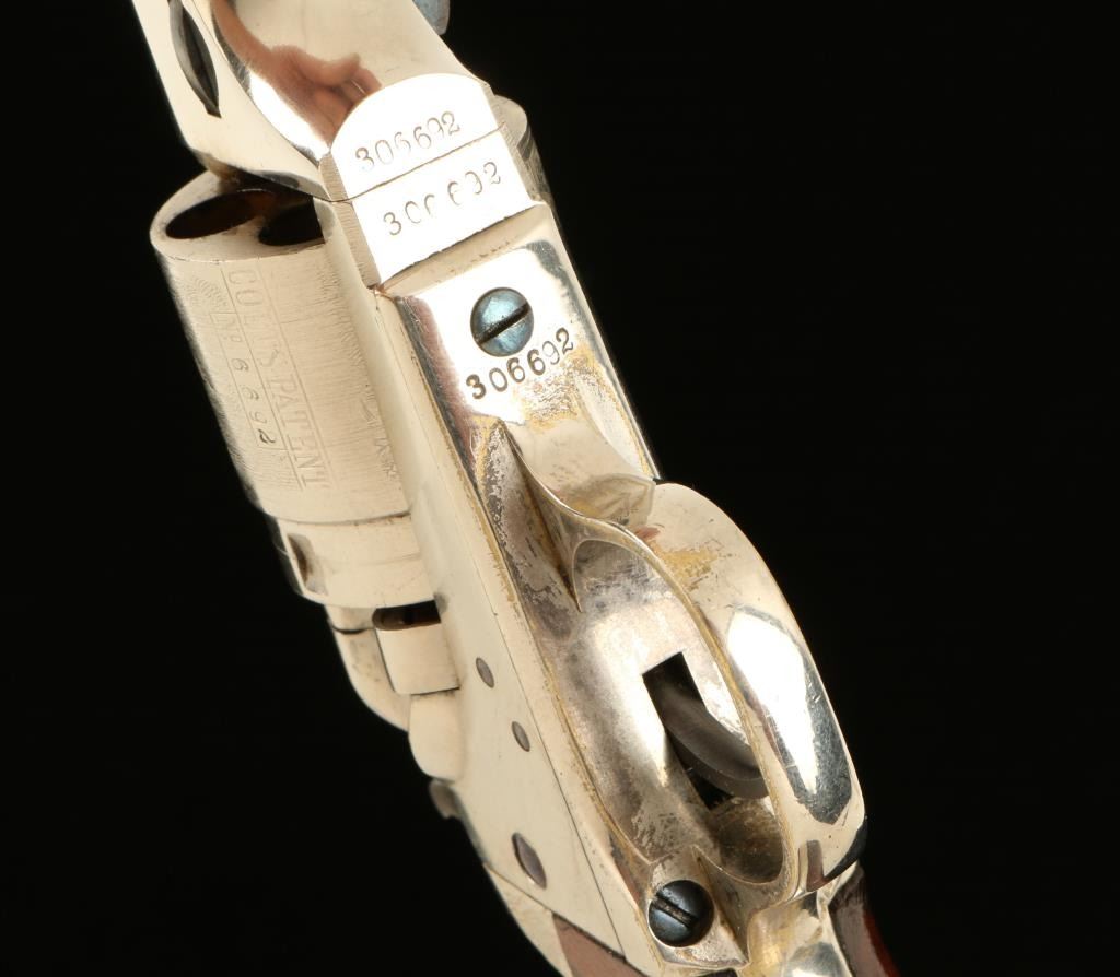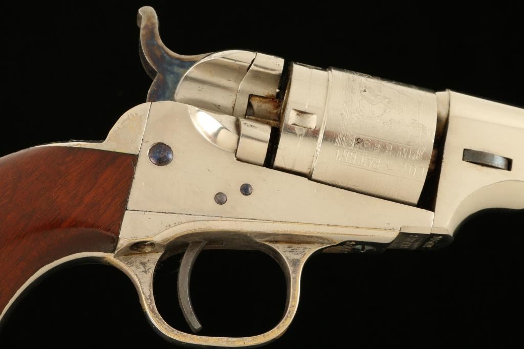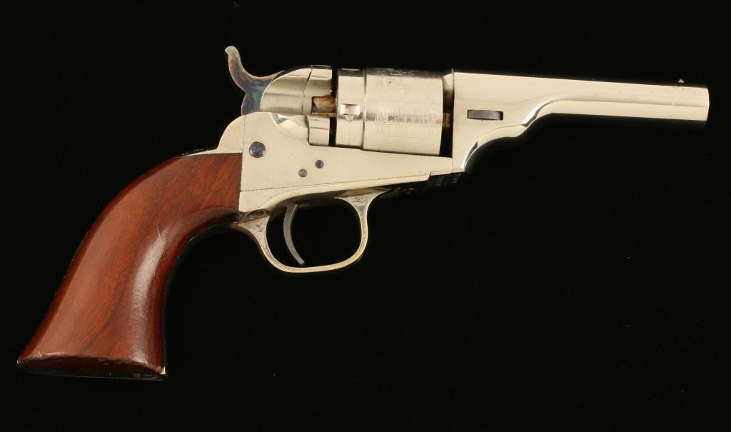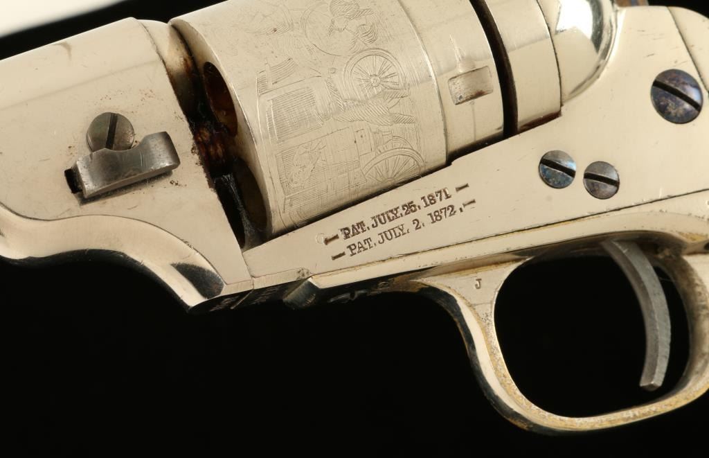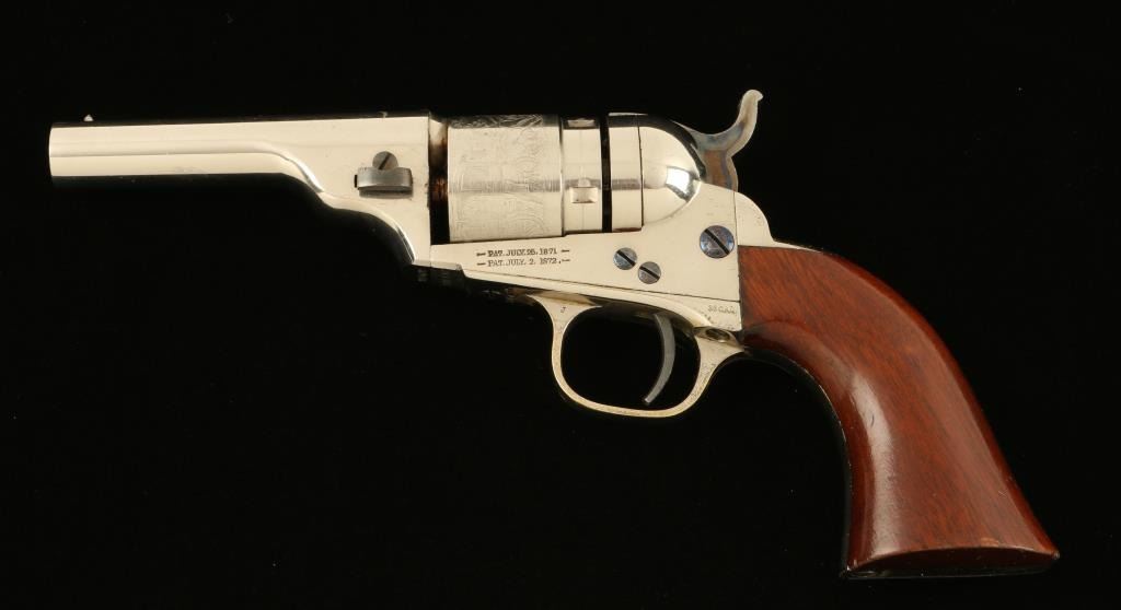 Beautiful Colt Pocket conversion revolver, .38 caliber, 3.5” barrel, S/N 306692, nickel finish, wood grips in overall near minty condition showing the majority of its finish with just a little flaking on the backstrap, crisp action, sharpmarkings, fine bore, fine cylinder scene, bright case colors on hammer, inky blued screws; fine grips. (Antique). Est.: $3,000-$6,000.