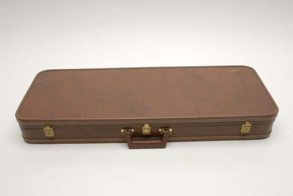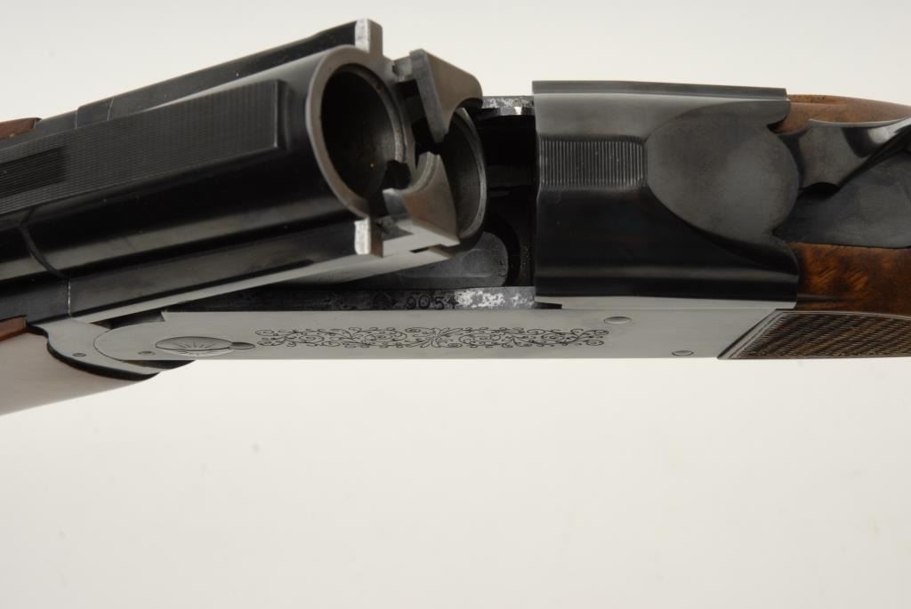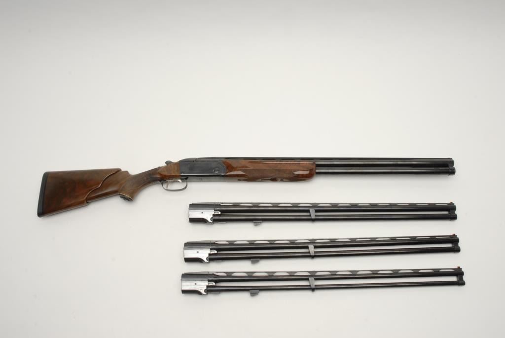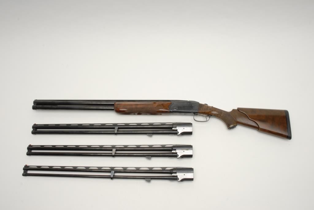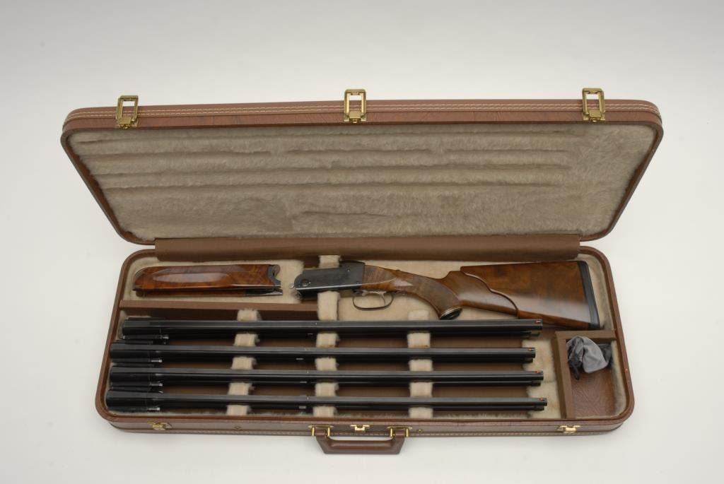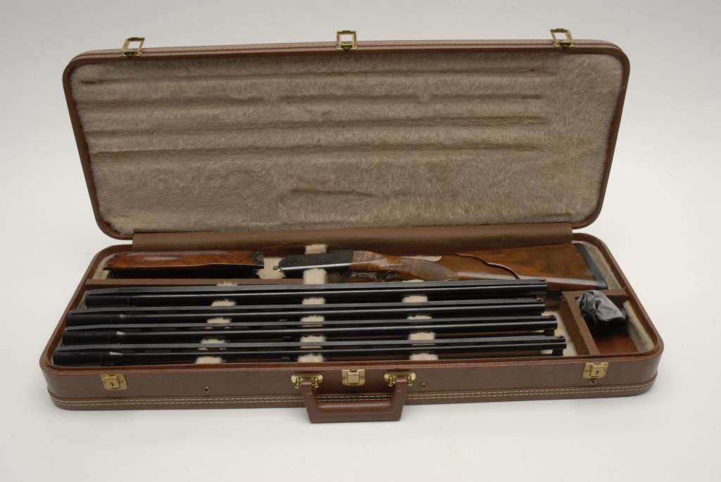 Krieghoff Model 32 four barrel set in 12 GA, 20, 28 and 410 with hydra coil recoil reducing wood stock (Custom) and Browning luggage case, S/N 9054 and all 4 barrels match. #1 12GA barrel measures 28” choked and cylinderwith bottom barrel ported. #2 20GA with 28” barrel choked modified over full #3 28GA with 28” barrel choked improved modified over improved cylinder. #4 410GA with 28” barrels and both barrels chokedimproved cylinder Professionally restocked and restored to excellent with 99% finish and slight use to stocks only. Est.: $8,000-$16,000