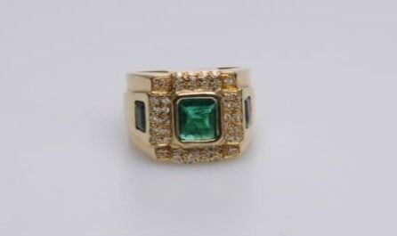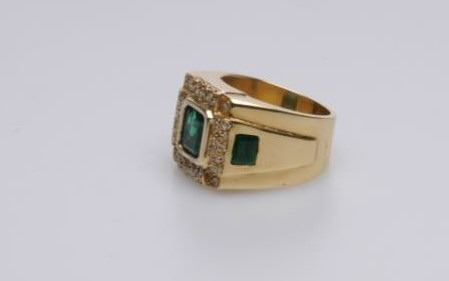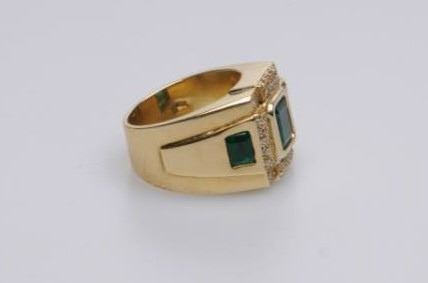 Lot 209a Man’s 18k custom ring set with 3 ½ CT emerald of high quality surrounded by diamonds and 2 accenti