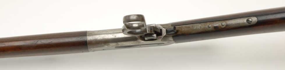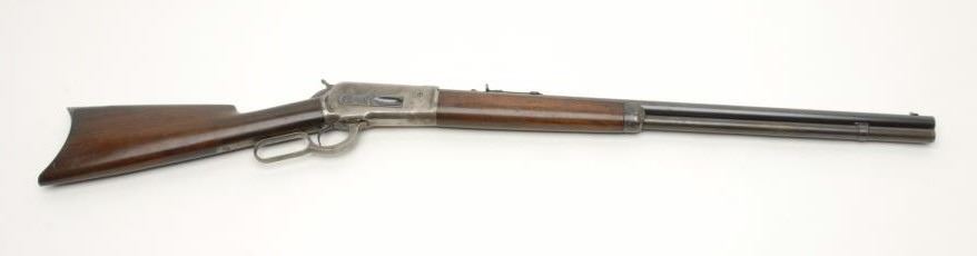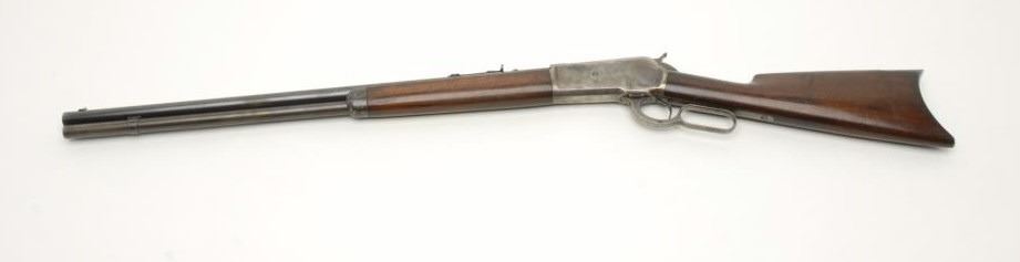 Winchester Model 1886 lever action rifle, .38-56 W.C.F. cal., serial #44370. The rifle is fine overall condition with a 26” round barrel and full-length magazine. The barrel features a silver blade front and standard elevator rearsights. The barrel and magazine retain approximately 80% of their original muted blue finish with wear noted at the muzzle. The receiver and lever show significant, attractive toning case colors, while the bolt and loadinggate have retained nearly all of their muted blue finish. The smooth wood stocks are in very good condition showing use but only small compressions and mars consistent with use. The butt stock ends with a smooth, metal crescent butt plate.The bore is very good, the action crisp and markings sharp on this desirable Model 1886. (Antique ). Est.: $7,000-$14,000.