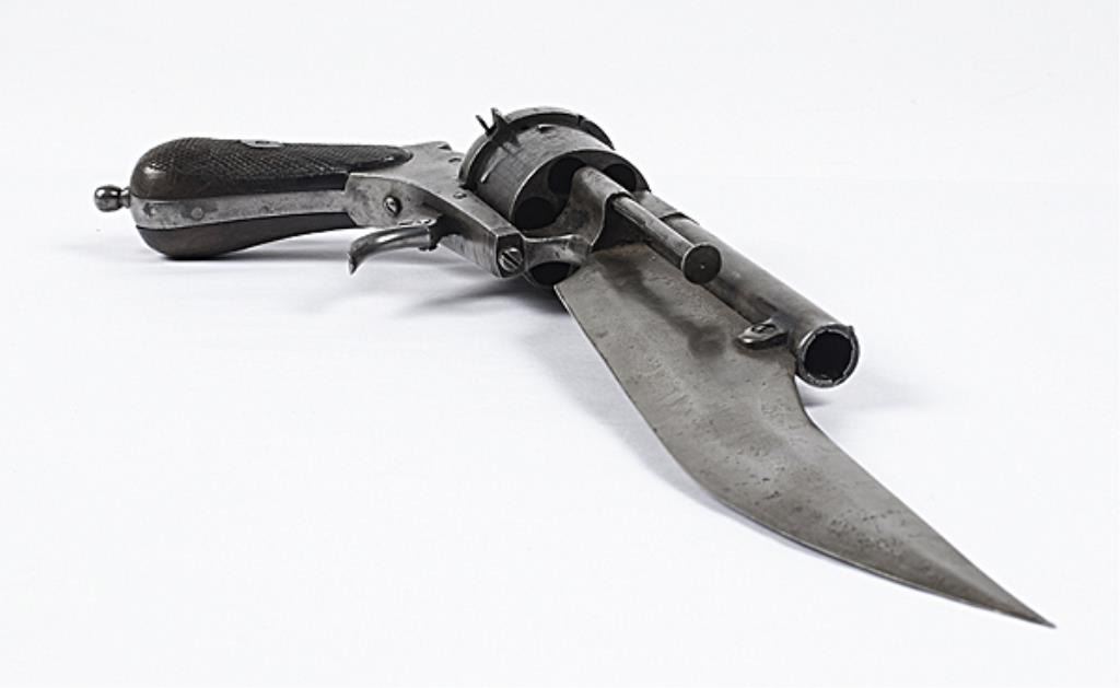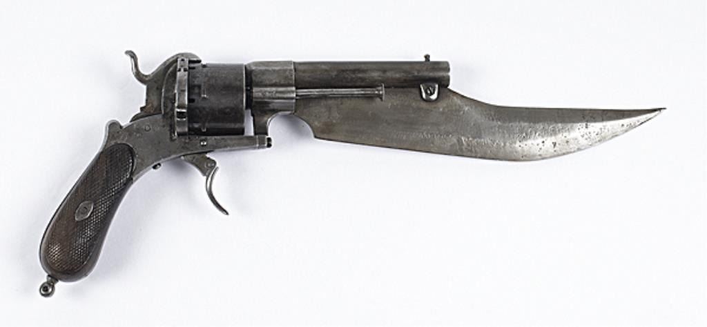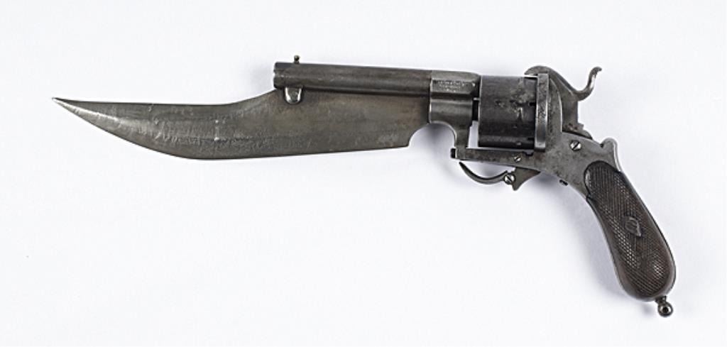 Spanish Lefaucheux Pinfire Revolver and Bowie Knife Combination, 12 mm, 4.75" round to octagonal barrel, S/N 10. 9" clip point blade attached underneath the barrel, marked "FRANCISCO / LARRHANAGA / EIBAR", folding trigger, checkedwalnut grips. Good. Bore has strong rifling, finish aging to gray, lacks lanyard ring.Est:$1,000-2,000