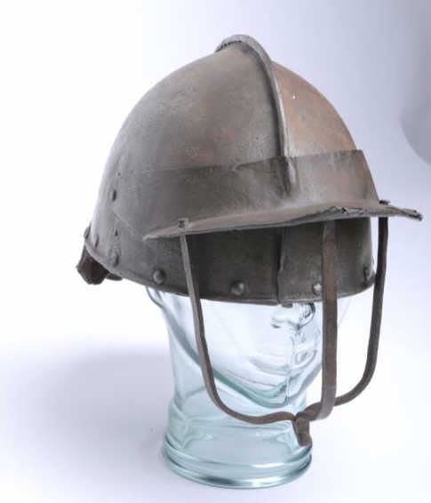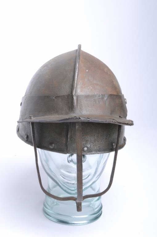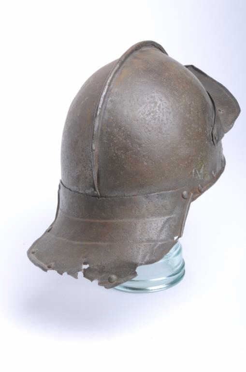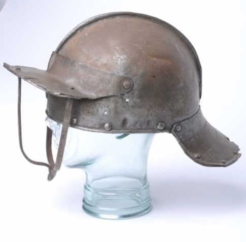 Lot 289 English Civil War era helmet with face guard and neck protector intact about Mid-17th century. Some