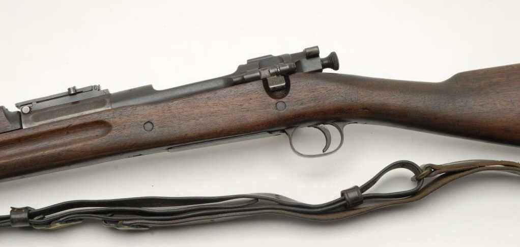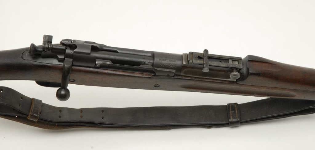 Model 1903 bolt action rifle by Springfield Armory, .30-06, S/N 574344, with Model 1907 original leather sling, in overall very good condition as rebuilt by SA, bore is good, action is crisp, 24” SA barrel dated 2-14, sharpmarkings; stock is overall good showing the rebuilt cartouche “SA/SPG”. (C&R). Est.: $600-$1,200.
