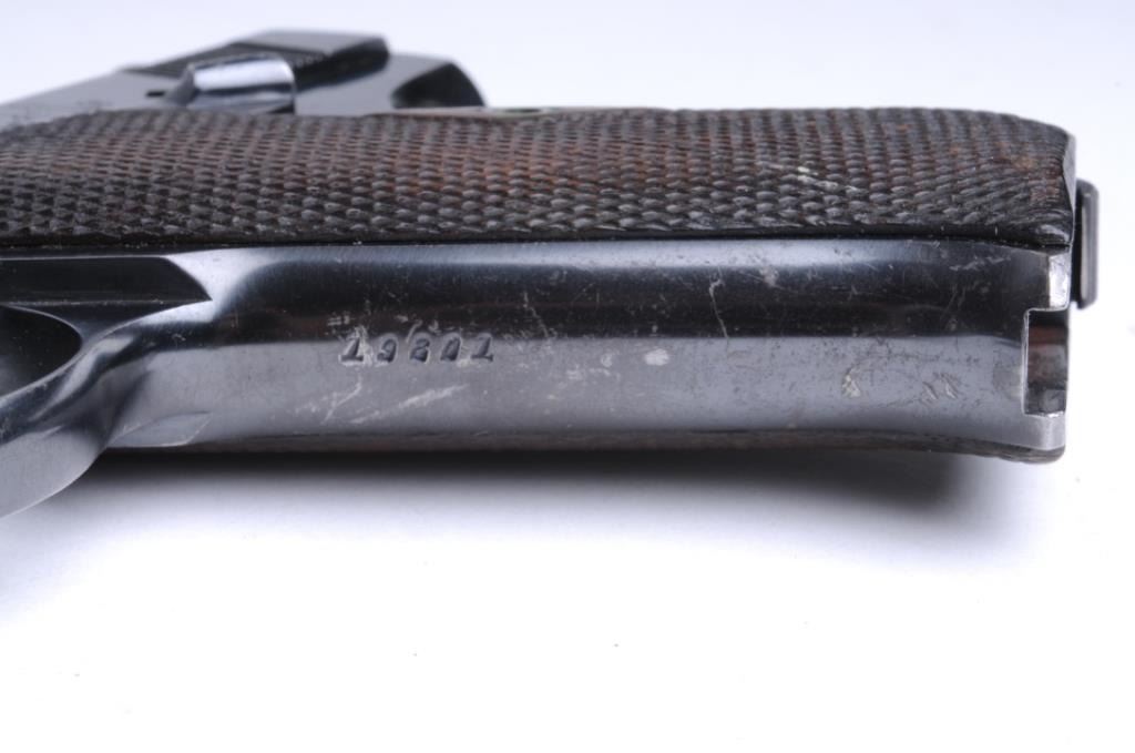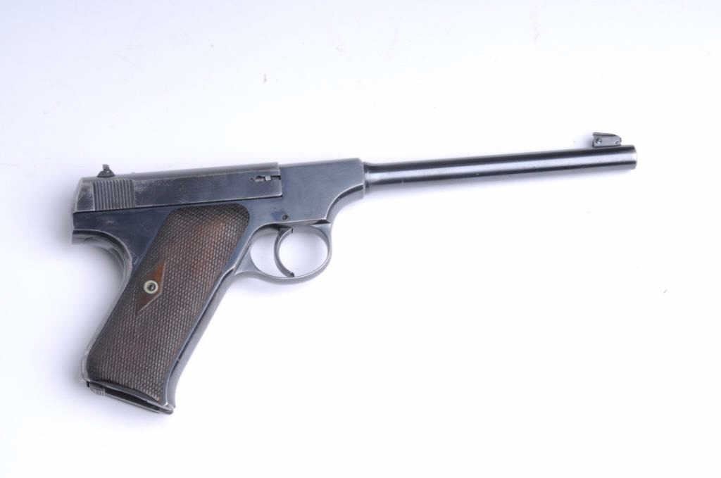 Colt Pre-woodsman Pistol, #19801, .22 LR, bore is fair may improve with cleaning. 6 ¾” barrel length, pitting on slide, 80% bluing, adjustable front sight and rear. 54,000 mfg. 1915-27, No mag Est. $400-$800.