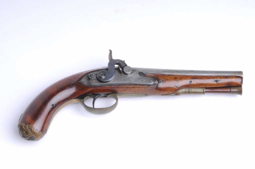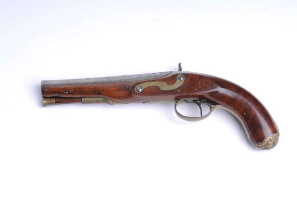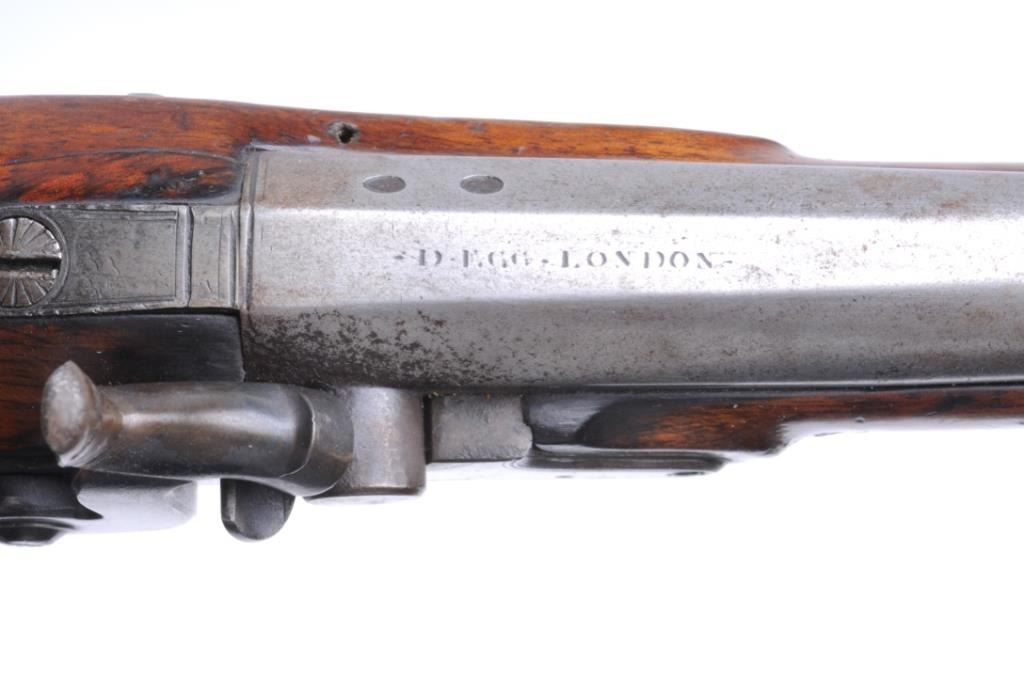 D. Egg London marked pistol with mask butt converted from flintlock to percussion. D. Egg was one of the top London makers in the early 19th century. The pistol measures 12” overall with a 6 ½” barrel of approximately .60 caliber smoothbore. The condition is good to very good with nice wood showing minor imperfections only. The action works well. Brass mountings with original matching ramrod. A premium maker to the royal and “Carriage Trade”. Est.: $900-$1800
