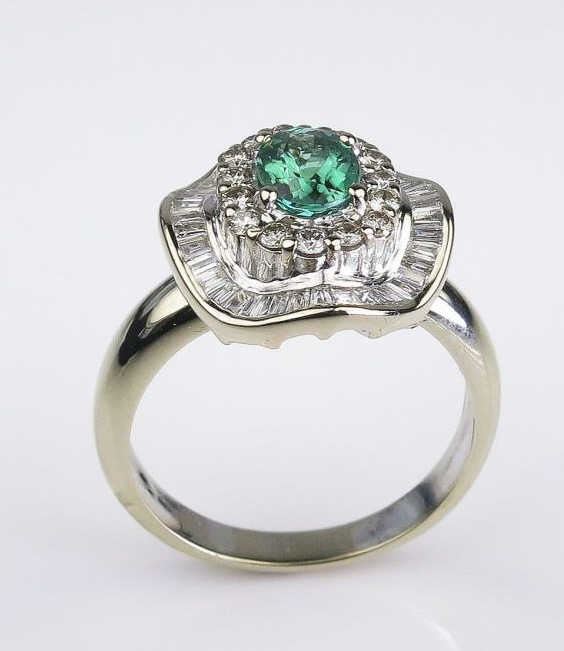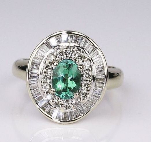 Exceptional ladies ring set with a very fine PARAIBA Teal Green Tourmaline weighing 1.02 carats and surrounded by 64 baguette and round diamonds weighing approx. 2.00 carats of G-H colors and SI clarity set in 14 karat white gold setting. Retail $5,000-$7,000 Estimates $3,000-$4,000 PARAIBA Tourmaline is a highly collectable gemstone.